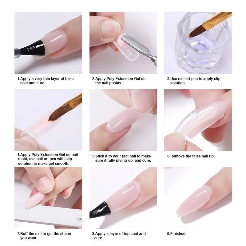 1. Используйте пилку для ногтей, чтобы потереть поверхность ногтя, а затем очистить ногти; 2. Нанесите тонкий слой базового геля, полимеризация светодиодной или УФ-лампой 30-60 с; 3. Выберите подходящие кончики для нанесения полигеля, используйте кисть для ногтей с раствором скольжения, чтобы сделать гель гладким; 4. Положите его к ногтю, отверждения с led или УФ-лампой 30-60s; 5. Снимите Кончики ногтей, обрежьте форму и отполируйте ногти; 6. Нанесите тонкий слой без протирания верхнего покрытия, отверждения с помощью светодиодной или УФ-лампы 30-60s;