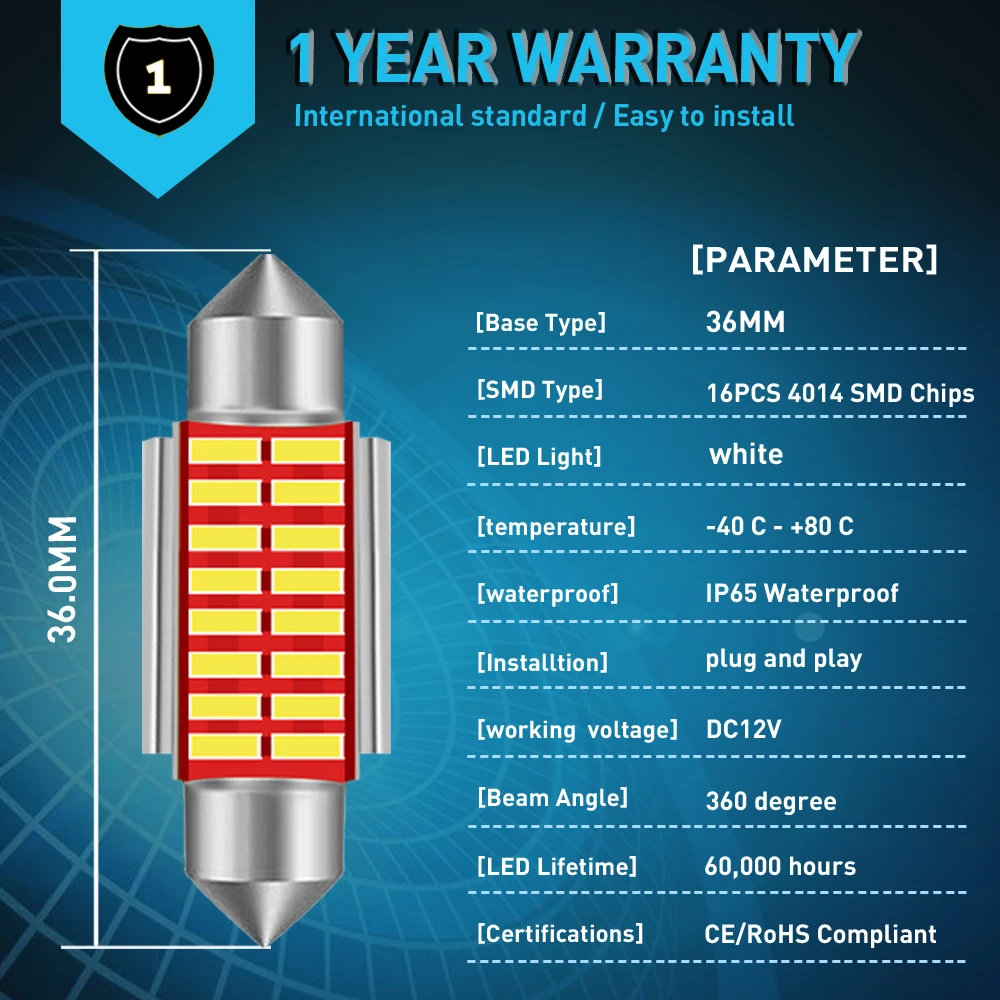 Тип цоколя: C5W светодиодный Canbus лампы Светодиодный Тип: 4014 SMD Угол луча: 360 градусов Рабочее напряжение: 12 В Светодиодный чип на плате) Срок службы: 50000 часов Размер: Длина: подходит для 31-41 мм Цветовая температура: 6000k Цвет: белый