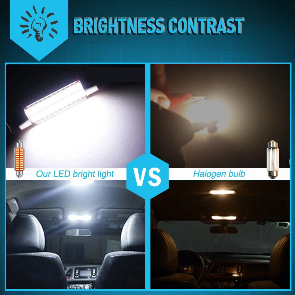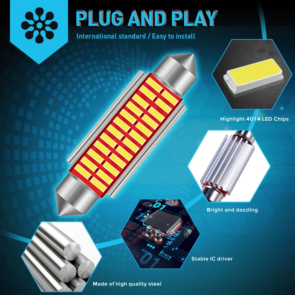 Тип цоколя: C5W светодиодный Canbus лампы Тип СВЕТОДИОДА: 4014 SMD Угол луча: 360 градусов Рабочее напряжение: 12 В Светодиодный срок службы: 50 000 часов Размер: Длина: подходит для 31-41 мм Цветовая температура: 6000k Цвет: белый