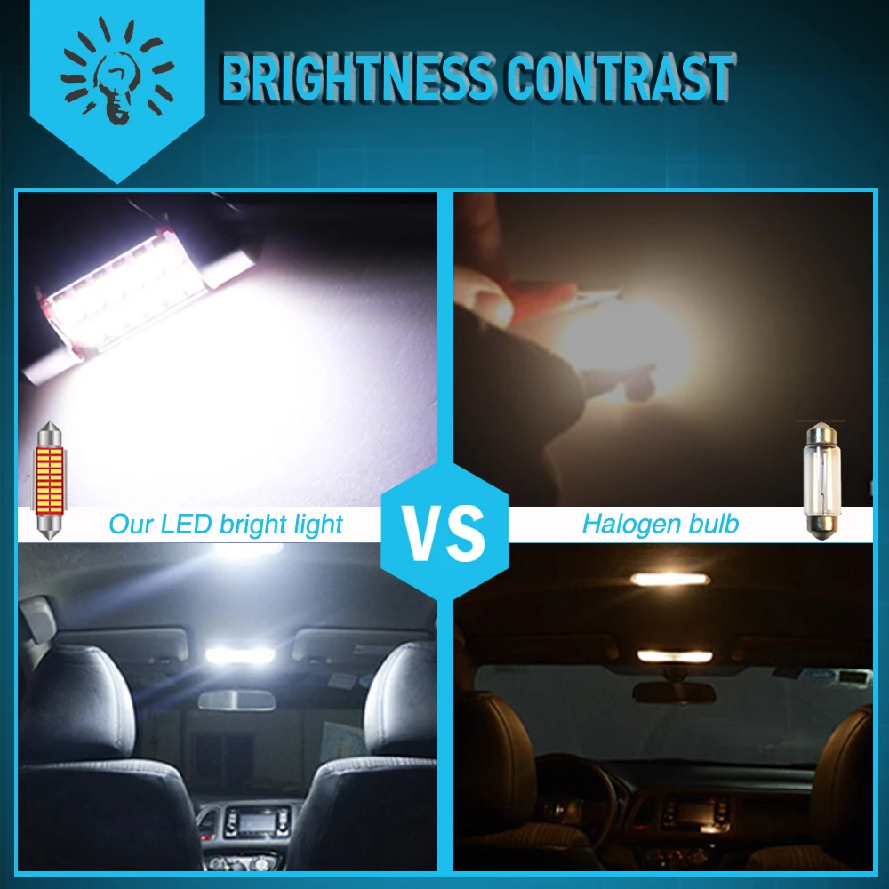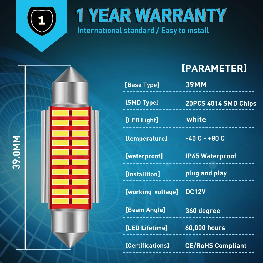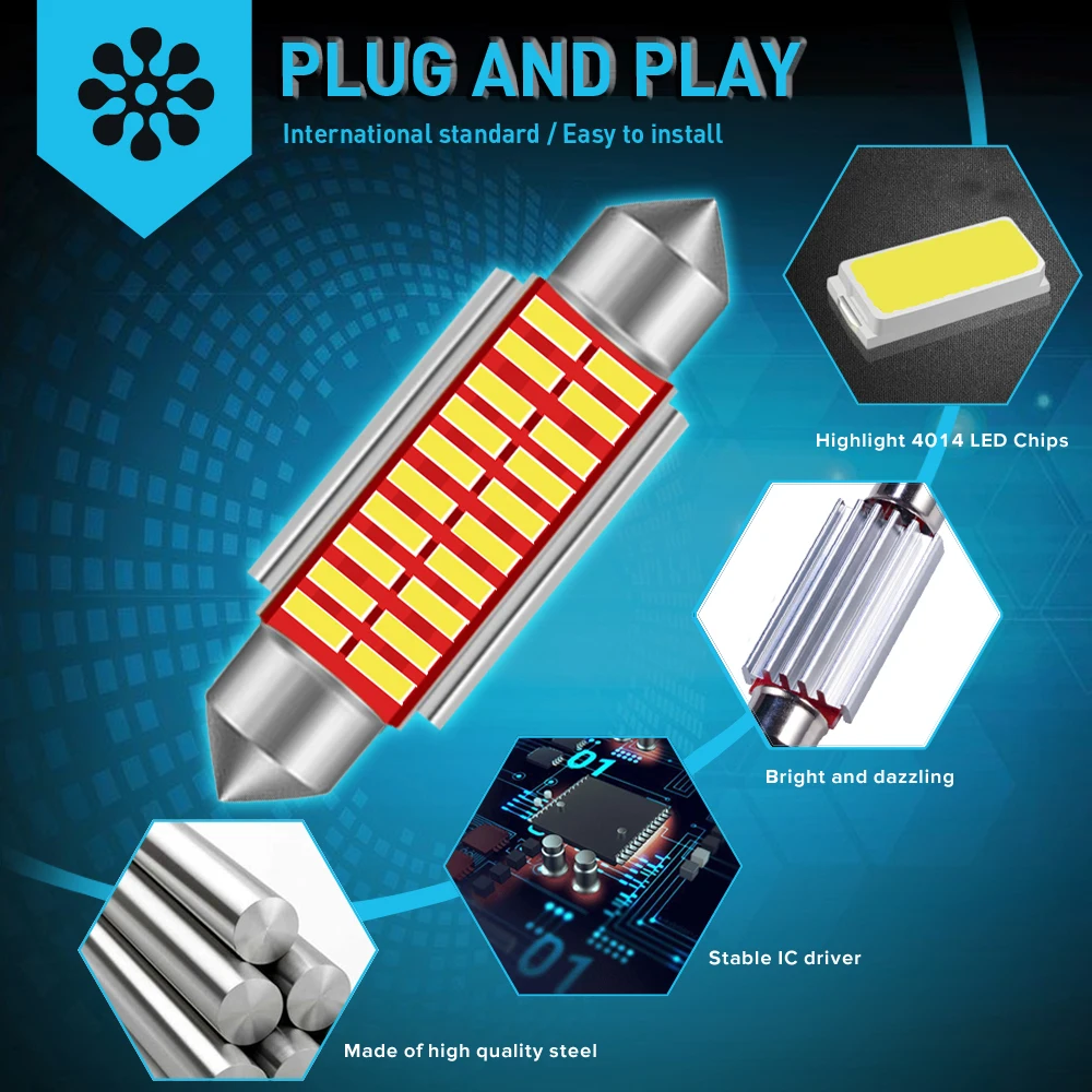 Тип цоколя: C5W светодиодный Canbus лампы Светодиодный Тип: 4014 SMD Угол луча: 360 градусов Рабочее напряжение: 12 В Светодиодный чип на плате) Срок службы: 50000 часов Размер: Длина: подходит для 31-41 мм Цветовая температура: 6000k Цвет: белый
