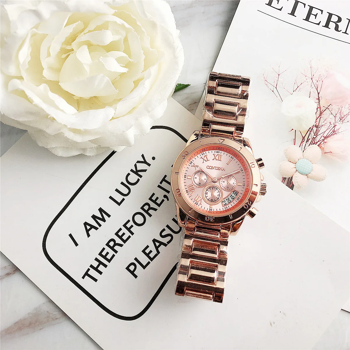 Ремешок Материал ремешка: легированная сталь Тип застежки: складная застежка Цвет браслета: розовое золото, золото, серебро Размер и вес Длина ремешка: около 23 см Диаметр циферблата: 3,5 см Толщина циферблата: 0,1 см Ширина ремешка: 1,8 см Примечание: Маленькие циферблаты не работают. Маленькие стрелки не работают.