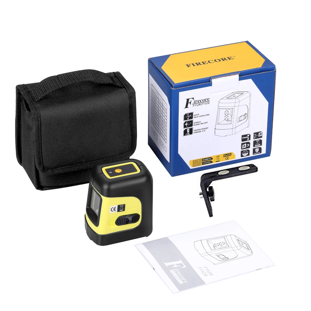 Водонепроницаемый/пылезащитный: IP55Класс лазера: класс 2Диапазон выравнивания: ± 4 °Точность: ± 3 мм/10 мДлина волны: 635 нмL-магнитный кронштейн резьба: 1/4"Источник питания: 2x1.5в AA батареи (не входят в комплект)Кнопка «ON»: открытый лазер, непосредственно для использования, кнопка режима верхнего наклона: Длительное нажатие, в режим наклона, лазер будет мигать медленно., лазерная линия наклоненаОсобенности:Принять самонивелирующийся (гравитационный маятник), удобный, надежныйИзлучает одну вертикальную линию и одну горизонтальную линию (автоматическое выравнивание в диапазоне 4 градусов)Как внутри, так и снаружи, мини размер, портативныйО функции наклона (функция блокировки):Функция наклона (наклон)-это функция, когда вы наклоняете его, он не будет звуковой сигнал, Лазерная линия будет мигать медленно.Посылка включает в себя:1 x F112R красный лазерный уровень (батарейки в комплект не входят)1 x Магнитный кронштейн 1/4''1 x Руководство по эксплуатации1 х сумка для переноски1 x коробка