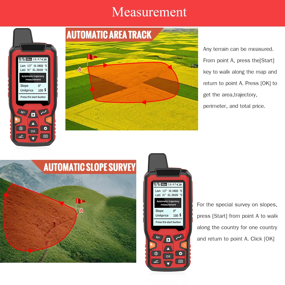 Чувствительный автоматический трек--- Автоматическое измерение трека, площадь и длина могут отображаться на одном экране. Высокочувствительная инкапсулированная антенна гарантирует точность измерений.