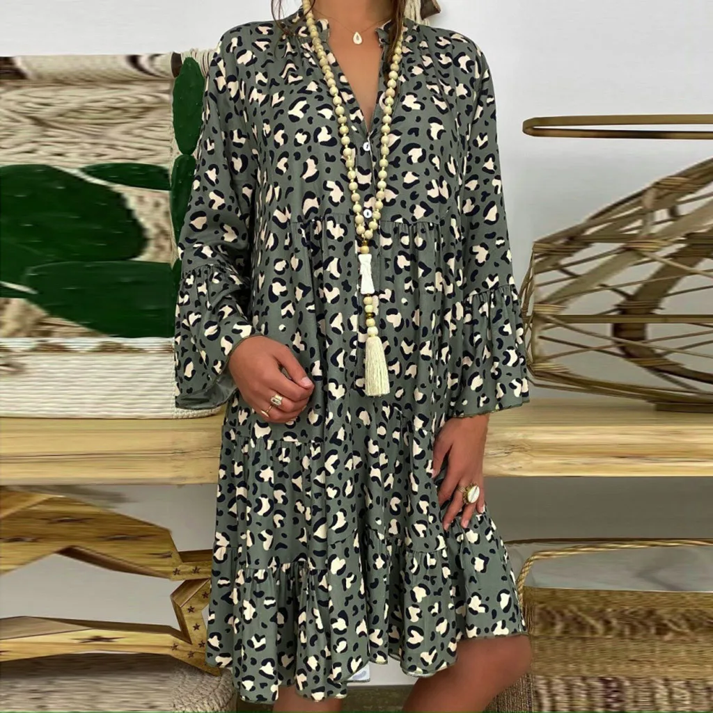 Женское свободное мини-платье на пуговицах с принтом и длинным рукавом, с V-образным вырезом, размера плюс