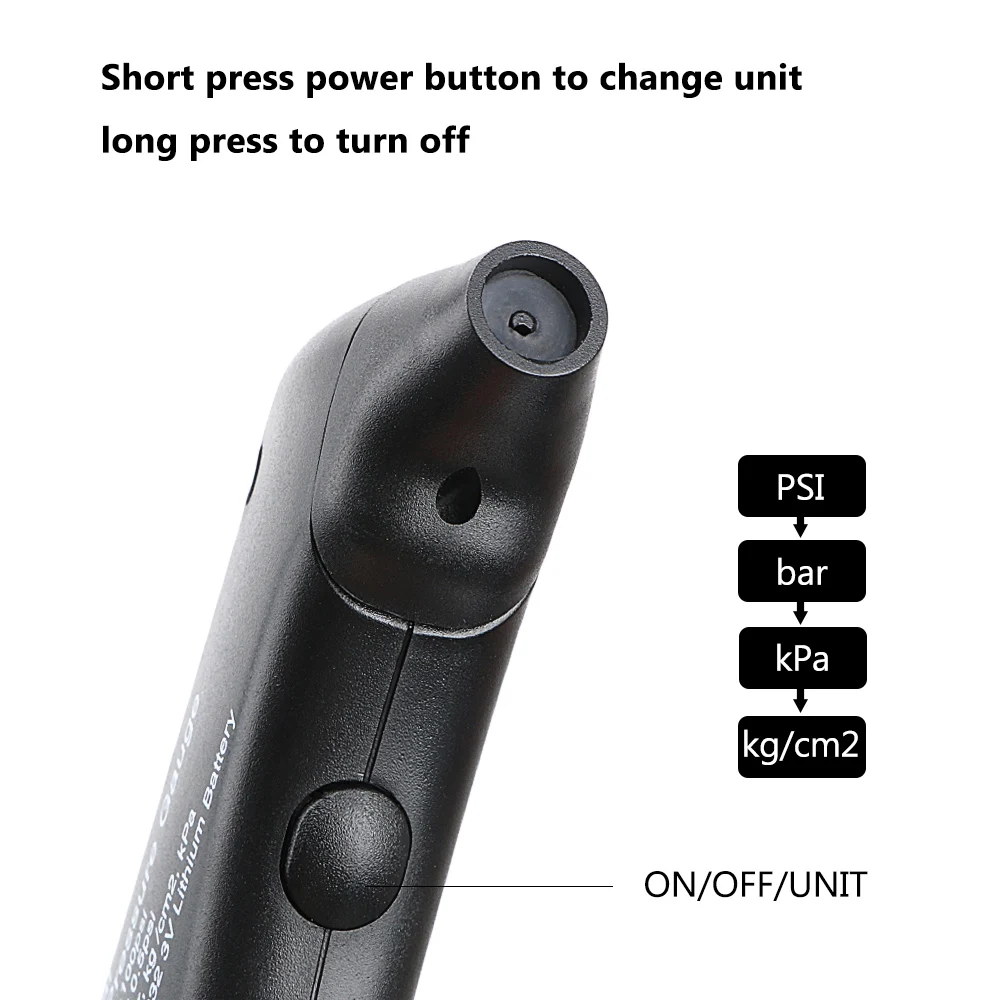 100% новый и высокое качествоАвтоматическое сохранение текущих данных для последующего чтенияЖК-дисплей, легко читаетсяЧетыре единицы в наличии: PSI, KPA, BAR,Кг/см²Небольшой портативный дизайн, легко держать и управлятьТочное и быстрое измерение, надежное в использованииРучное включение/выключение питания и автоматическое выключение для экономии энергииТехнические характеристики: