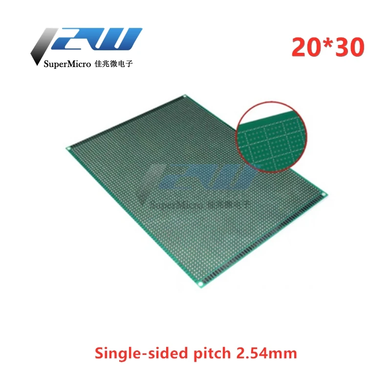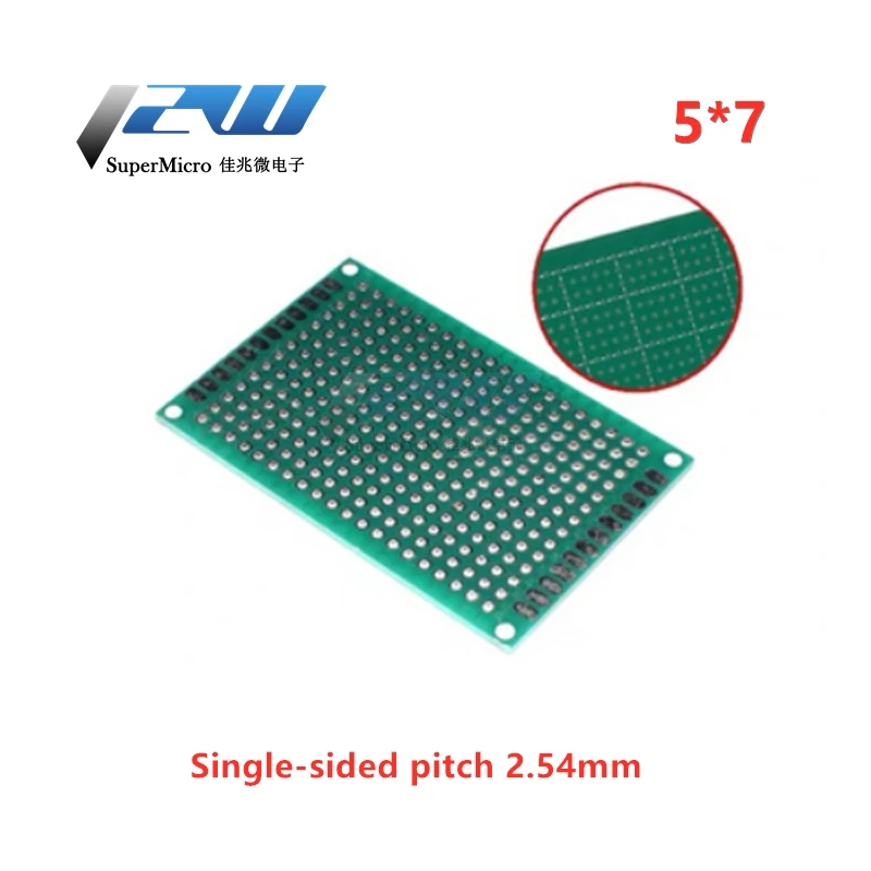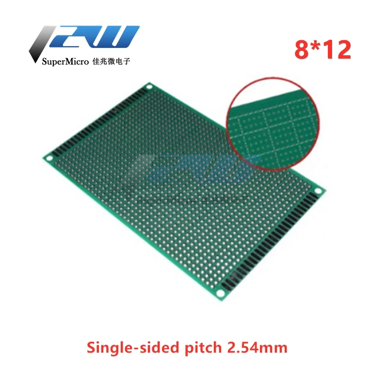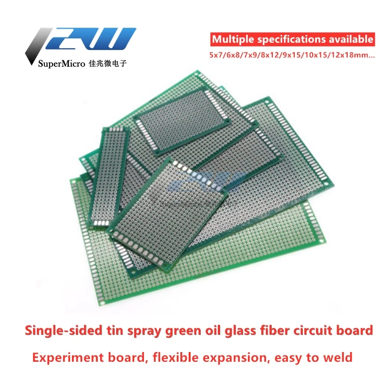 Печатная схема 2,54 мм односторонняя спрей КСП FR-4 Зеленый масло стекловолокно отверстие доска Расстояние между отверстиями: 2,54 мм/2,0 мм Диафрагма: 1,0 мм Толщина: 1,6 мм (плюс или минус 0,05-0,1 допустимая погрешность) Материал: FR-4 лист