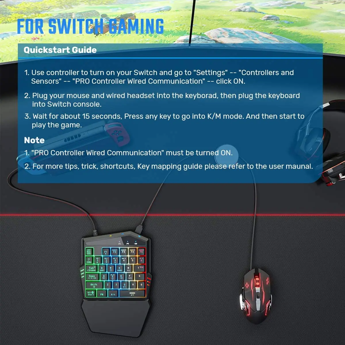 Сначала Подключите оффический контроллер к клавиатуре, затем подключите мышь и установите на клавиатуру, затем подключите клавиатуру к консоли. (Убедитесь, что контроллер выключен перед подключением и использованием usb-кабеля для зарядки и синхронизации)