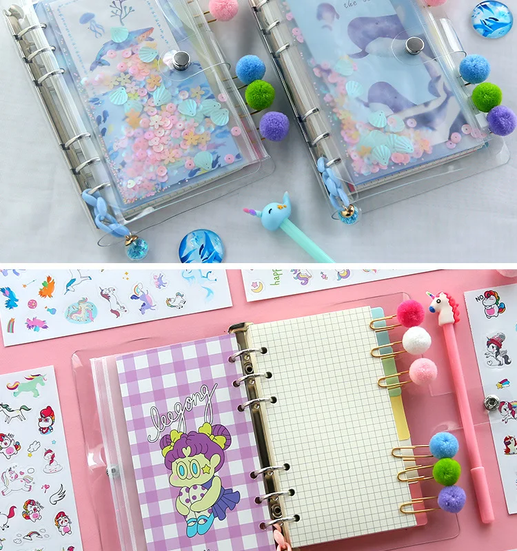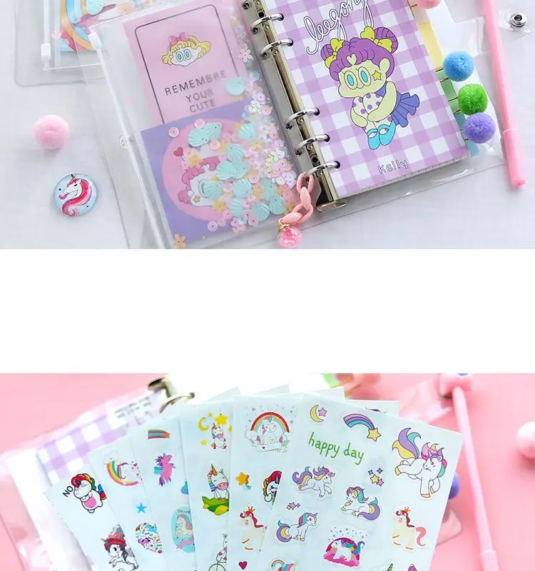 Transparent case + 6-hole slip sheet Sequin storage bag x1 40 square inner pages 40 horizontal pages Dividing Ruler x1 Hairball Paper Clip x6 Gel Pen x1 Paper jam x1 Paper jam x1 Star Ball Charm x1 Glass patch x1 Color separation page x5 Unicorn sticker x6