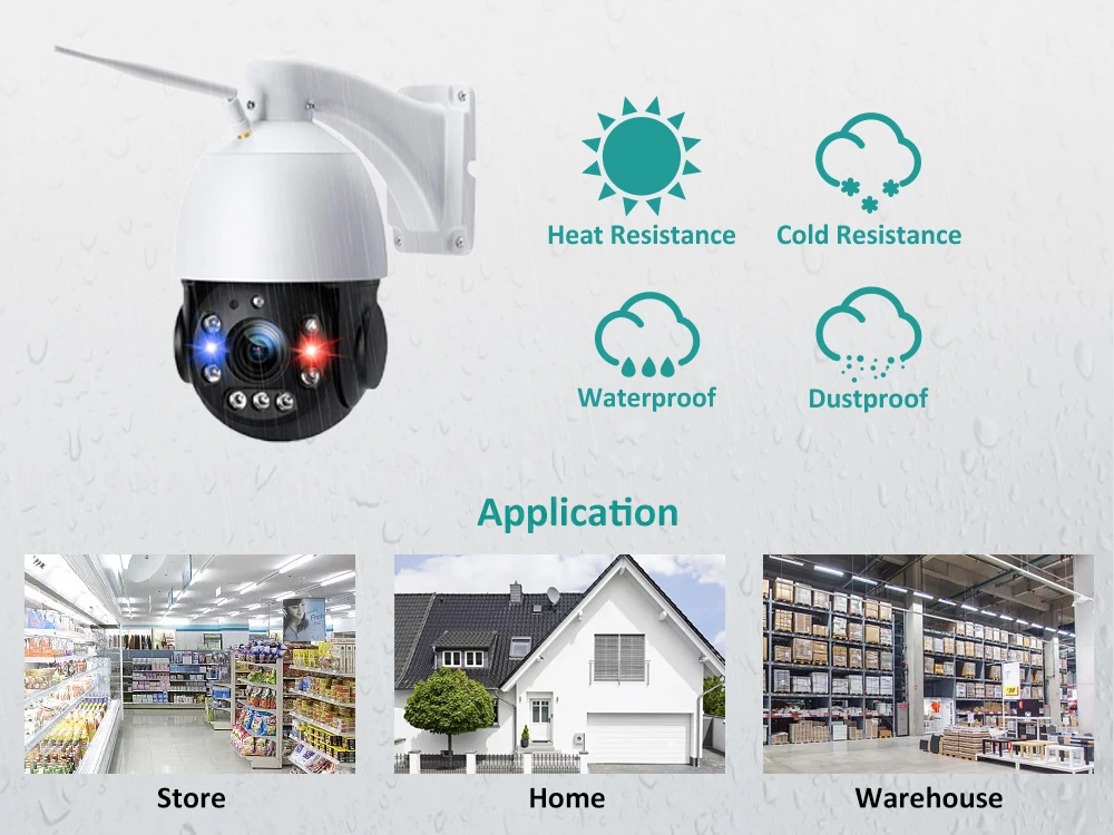 Наша камера подходит как для наружного, так и для внутреннего использования. IP66 Всепогодный Дизайн для использования в нескольких сценариях (офис, улица, дом, фабрика, maket и т. Д.). Рабочая температура камеры:-25 °C ~ 50 °C (-13 ℉ ~ 122 ℉)
