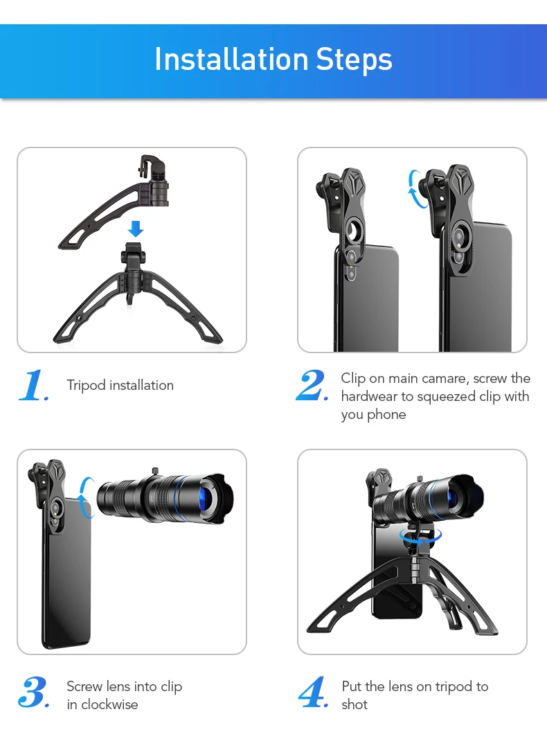1x 20-40x объектив телескопа 1x mini selfie штатив-Трипод 1x Универсальный металлический зажим 1x с наглазником 1x сумка для переноски 1x Руководство пользователя 1x Салфетка для уборки 1x подарочная коробка
