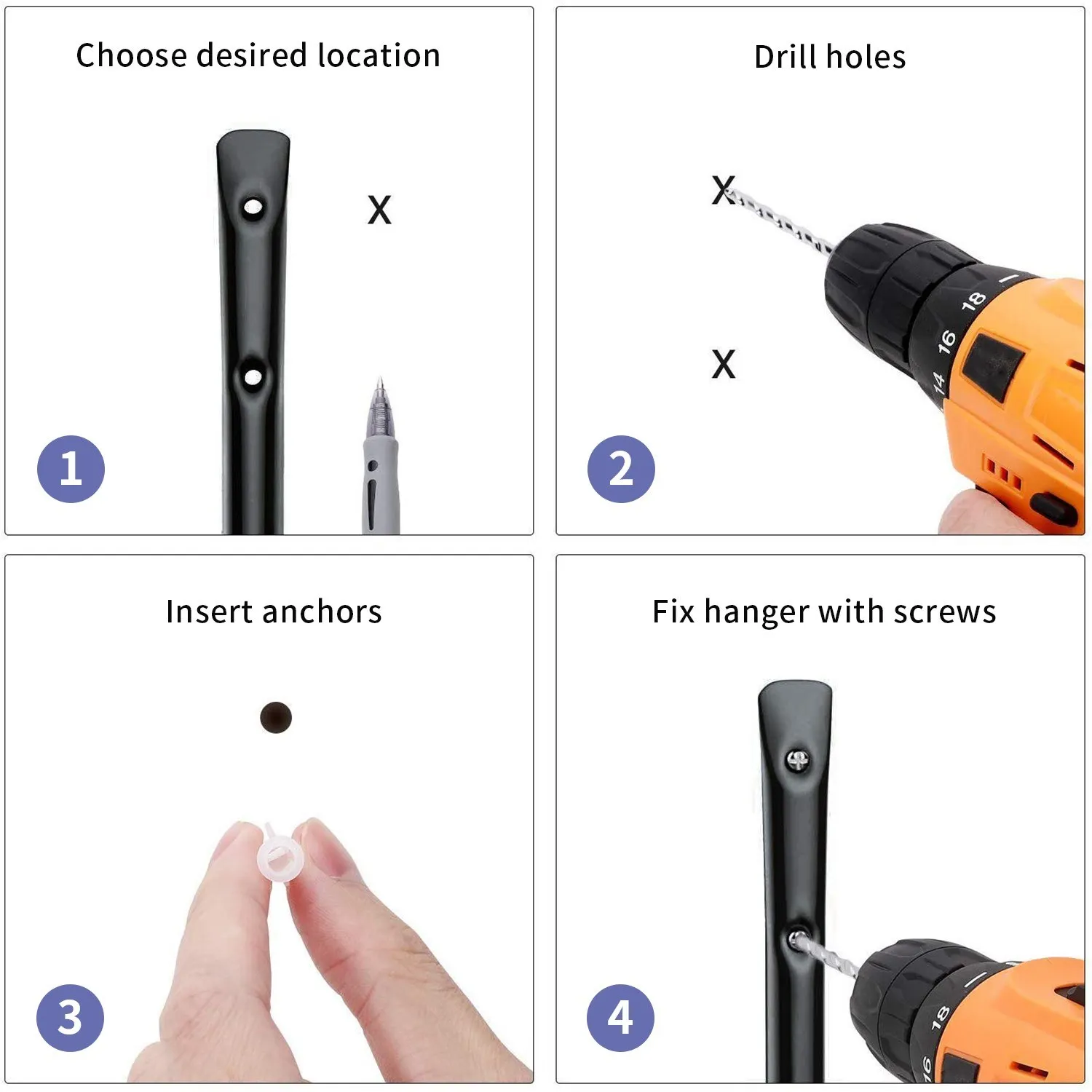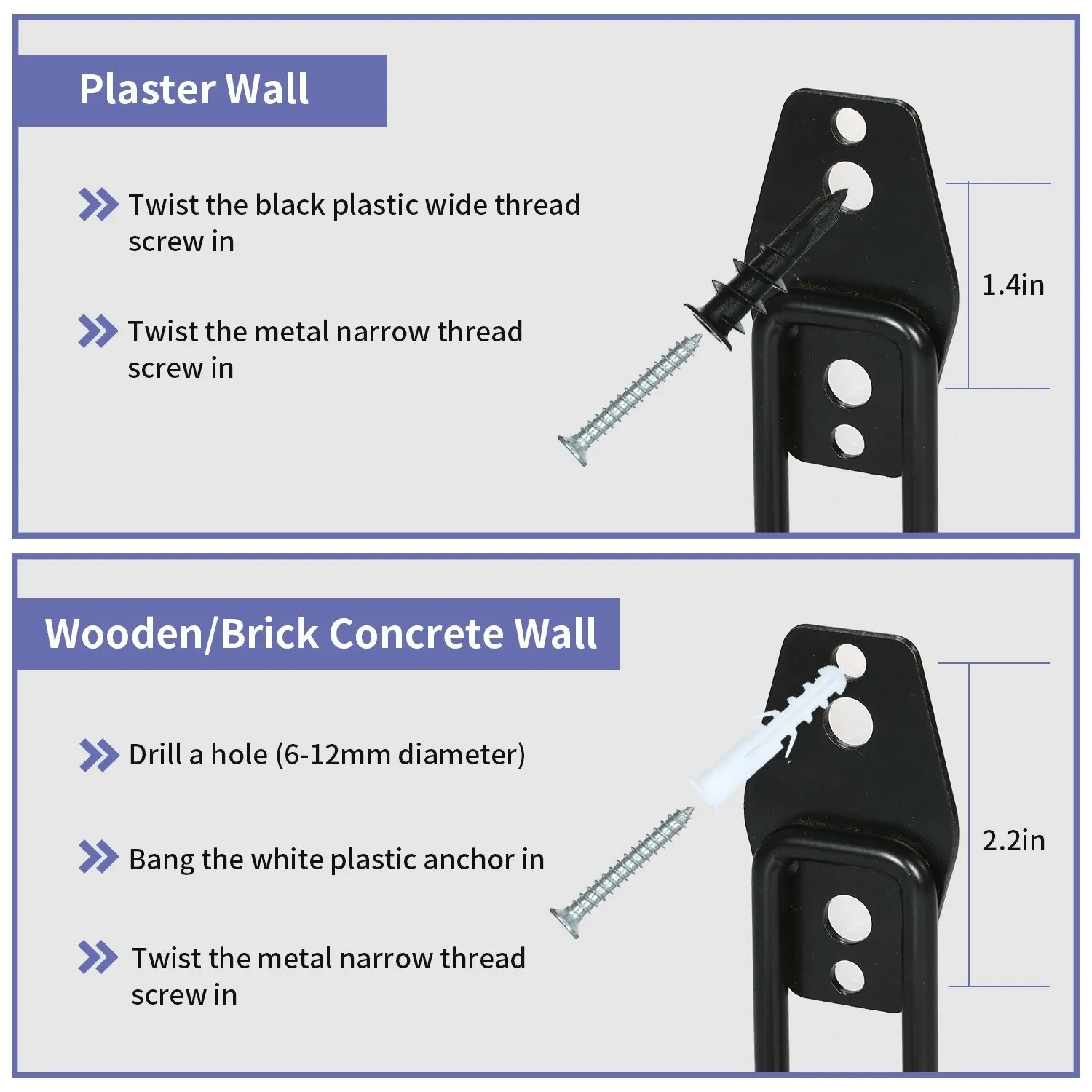 2 вида винтов для различных стен --- черные широкие резьбовые заглушки для использования на гипсовой стене и белые расширительные якоря для использования на деревянных, кирпичных и Бетонных стенах, оба требуют стальных винтовых гвоздей.