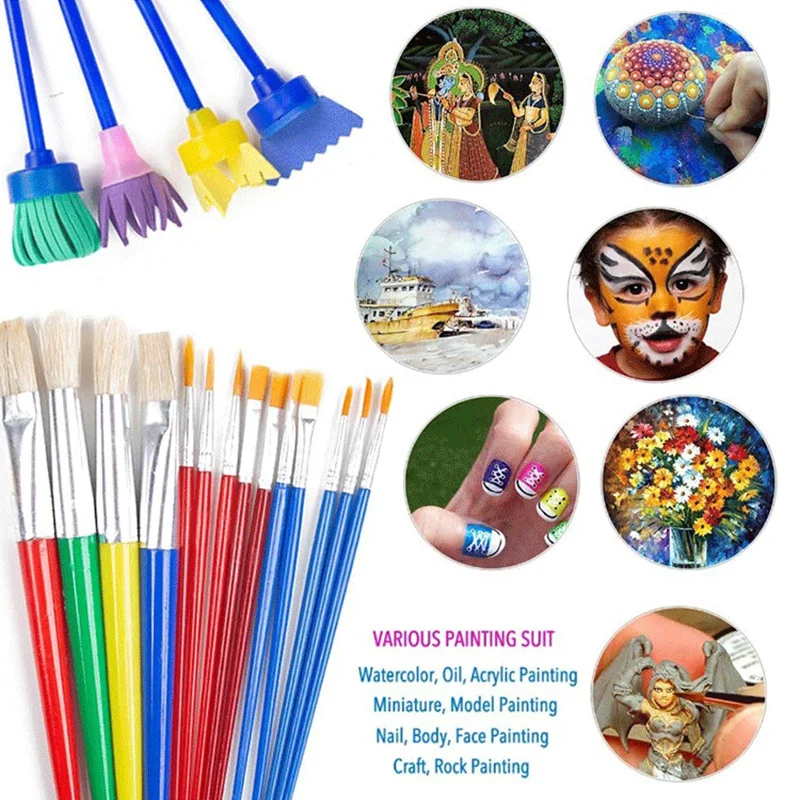 1. Посылка включает в себя: 4 круглых щетинок, 10 детальных кистей для краски, 6 Плоских кистей для краски, 4 губки для рисования кистей для рисования, 4 чашки для нанесения краски, 6 шт Цвет palettes.12 различных типов отвечают всем студентам требования к окраске.