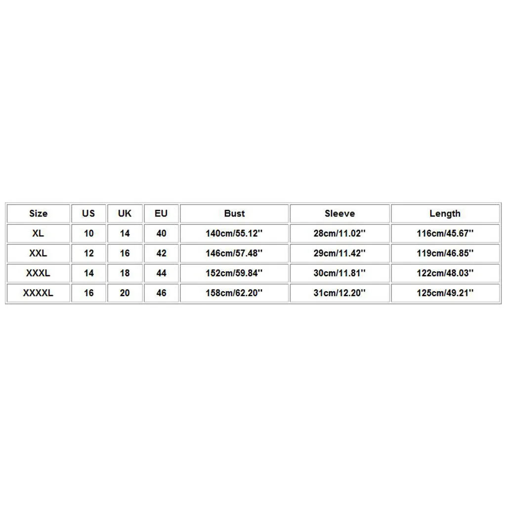 Размер США Великобритания ЕС Бюст Рукав Длина XL 10 14 40 140 см/55,12'' 28 см/11,02'' 116 см/45,67'' XXL 12 16 42 146 см/57,48'' 29 см/11,42'' 119 см/46,85'' XХХL 14 18 44 152 см/59,84'' 30 см/11,81'' 122 см/48,03'' XXXXL 16 20 46 158 см/62,20'' 31 см/12,20'' 125 см/49,21''
