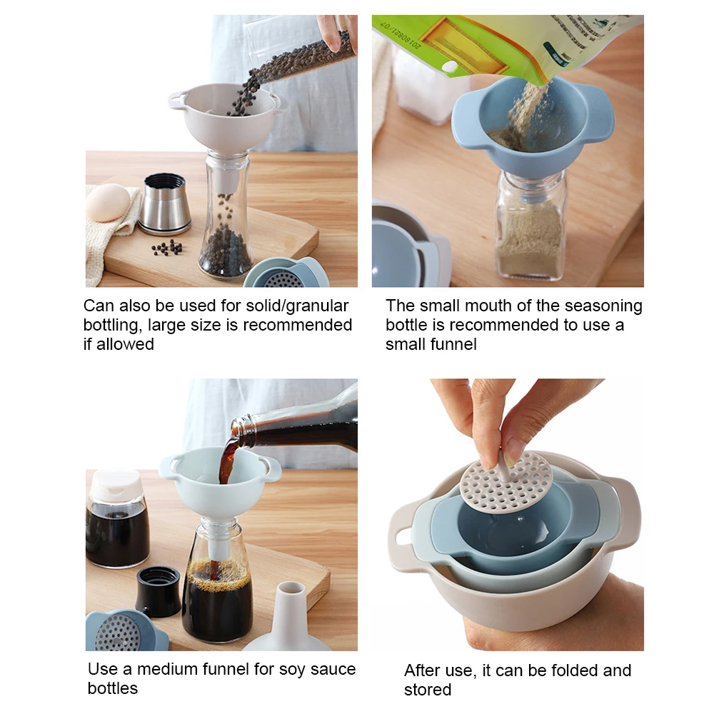 -4-в-1 воронки-поставляется в 3 больших размеров комплект удобной для ваших различных потребностей, а также включает в себя съемное сито для того, чтобы помочь предотвратить стволовых Джем.