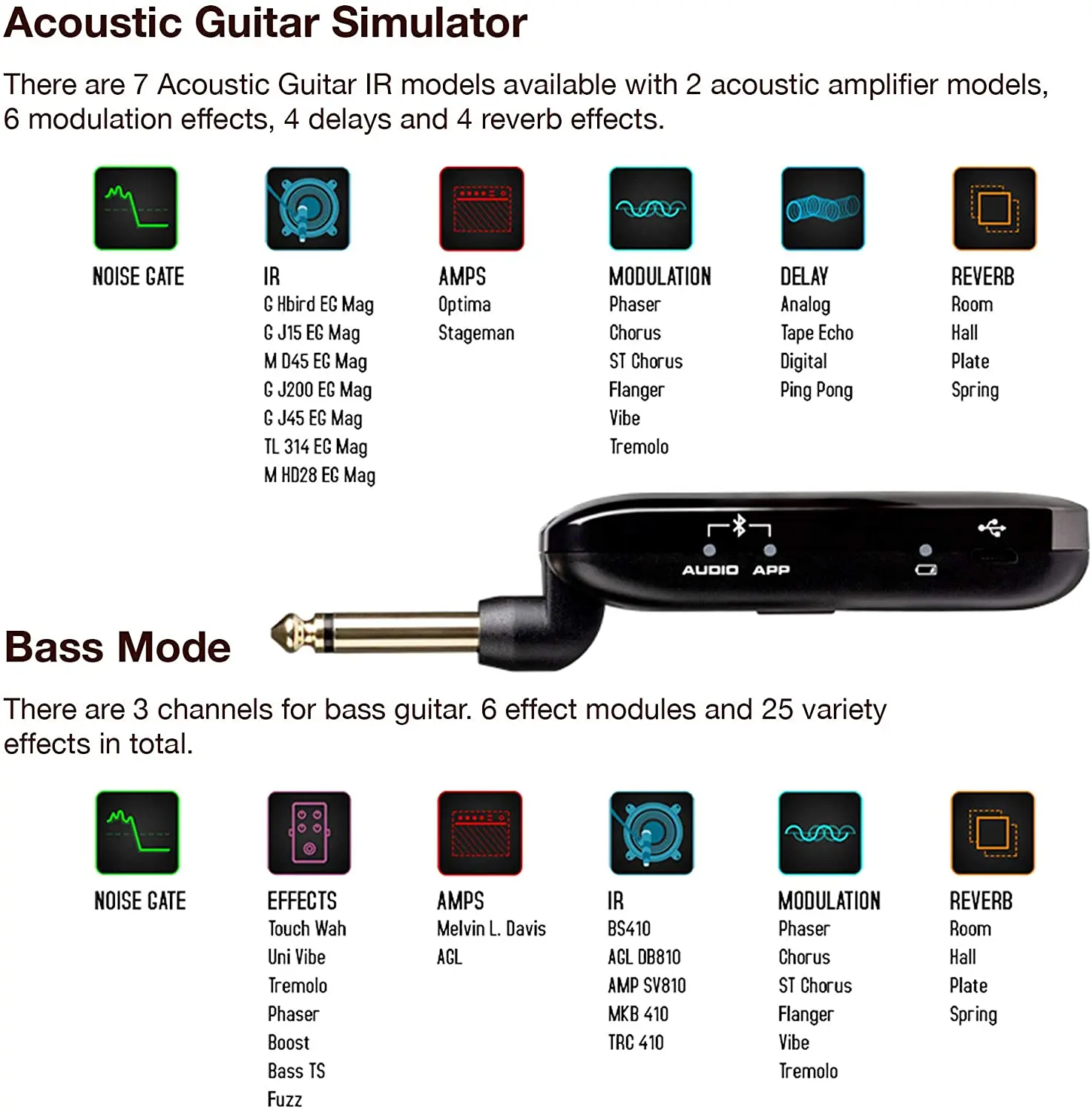 Mighty Plug-это удобная Бесшумная передача для гитаристов и bassists, отличающаяся различными эффектами, усилителями моделирования и моделями шкафа импульсного отклика (IR). Со встроенными акустическими гитарными ИК-моделями и акустическими усилителями вы можете играть на обычной электрогитаре для имитации акустической гитары. Встроенные барабанные узоры позволяют вам играть вместе с вашими любимыми музыкальными стилями. Характеристики: Гитара: 1 шумоподавление, 7 эффектов stompbox, 9 моделей amp, 8 гитарных шкафов IR's, 6 эффектов модуляции, 4 задержки, 4 эффекта реверберации для электрогитары s Симулятор акустической гитары: 7 ИК-моделей акустической гитары, 2 модели акустического усилителя, 6 эффектов модуляции, 4 задержки, 4 эффекта реверберации Басовый режим: 3 канала для бас-гитары. 6 модулей эффектов, 25 различных эффектов в общей сложности Перезаряжаемый литиевый аккумулятор: 3 часа воспроизведения Барабанные удары: 10 узоров и метроном