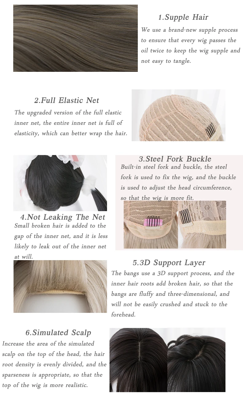 1. Эластичные волосы Мы используем совершенно новый гибкий процесс, чтобы гарантировать, что каждый парик проходит масло дважды, чтобы сохранить парик Эластичный и не легко запутывается. 2. Полностью эластичная сетка Обновленная версия полностью эластичной внутренней сетки, вся Внутренняя сетка полна эластичности, которая может Лучше оберните волосы. 3. Стальная вилка пряжка Встроенная Стальная вилка и пряжка, Стальная вилка используется для фиксации парика, а Пряжка используется для регулировки Окружность головы, так что парик более подходит. 4. Не протекает сеть Небольшие сломанные волосы добавляются в зазор внутренней сети, и они меньше вероятность протекания из внутренней сети По желанию. 5.3D поддерживающий слой Челка использует процесс поддержки 3D, и внутренние корни волос добавляют сломанные волосы, так что челка Пушистый и трехмерный, и не будет легко раздавлен и приклеен к лбу. 6. Искусственная кожа головы Увеличение площади искусственной кожи головы на верхней части головы, плотность корня волос равномерно разделена, И искренность подходит, так что верх парика более реалистичный.