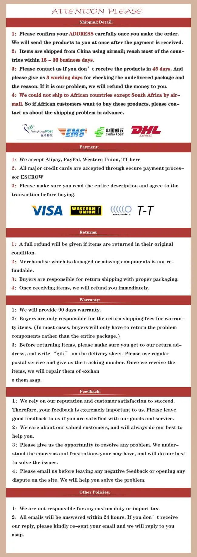 4. Когда вы получаете продукт, если вы чувствуете себя удовлетворенным, пожалуйста, дайте нам пять звезд высокой оценки; Если вы не удовлетворены, пожалуйста, свяжитесь с нами в первый раз. Мы постараемся сделать все возможное, чтобы решить эту проблему до достижения удовлетворительного результата.