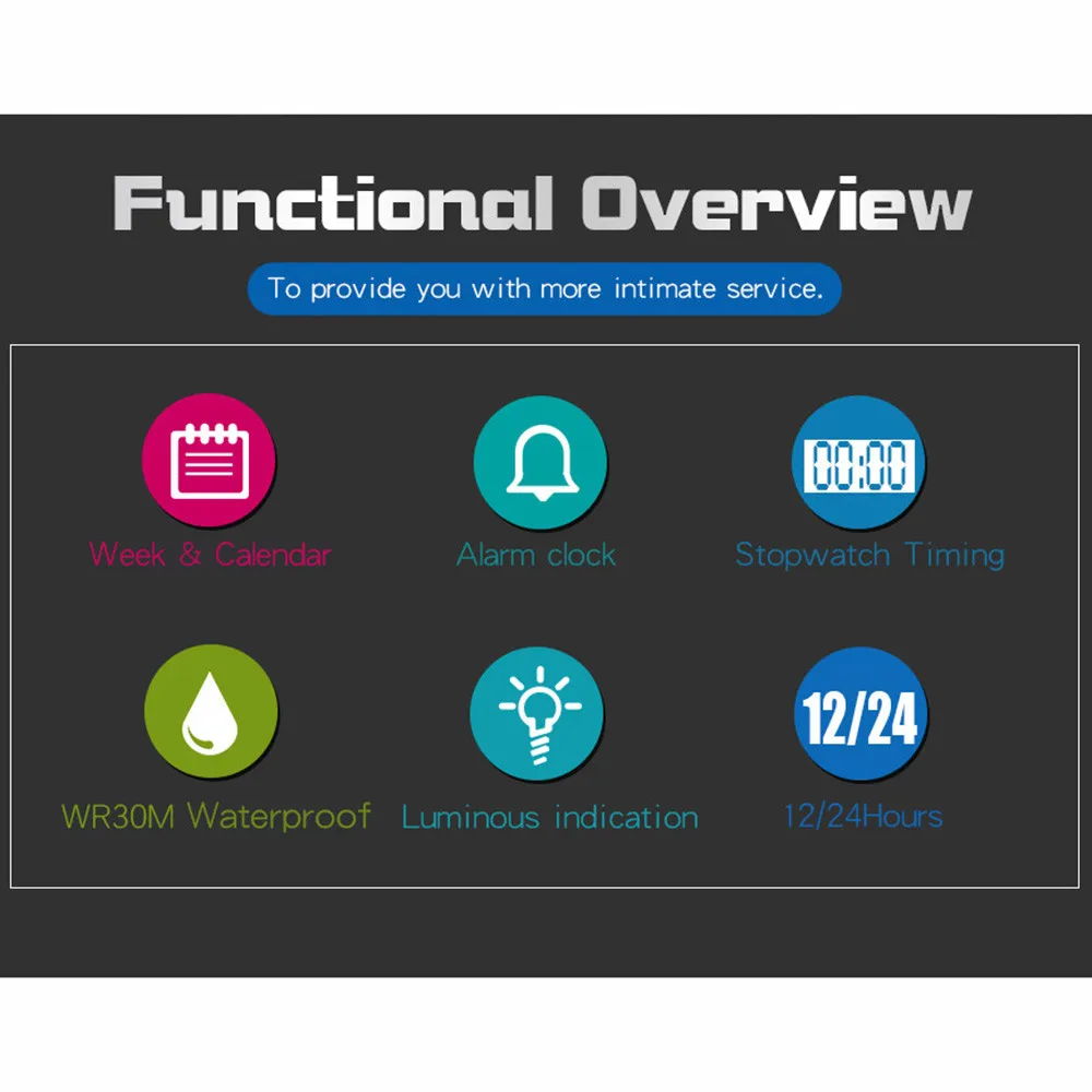 Функция: светящийся, будильник, WR30M водонепроницаемый, ежечасный час, секунды работы, отображение дня недели, 12/24 часовая система