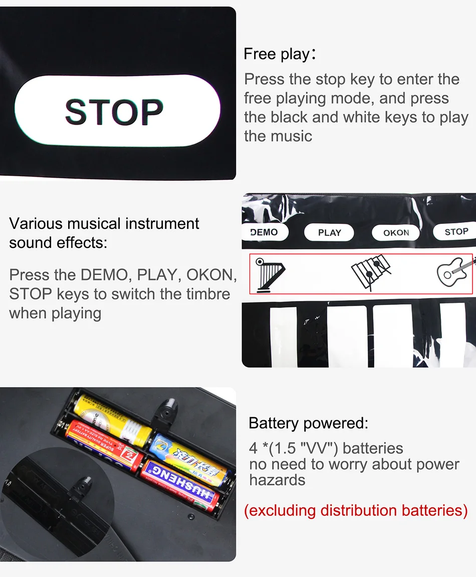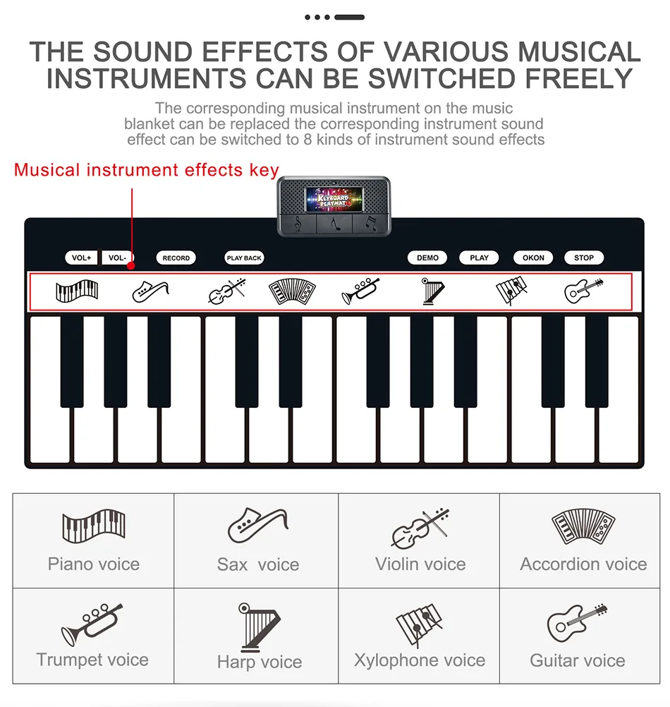 🔵Этот музыкальный игровой коврик имеет 10 демонстрационных песен, нажмите кнопку demo для демонстрации музыки, одна черная клавиша соответствует мелодии. 🔵И он имеет 8 инструментов звукового эффекта, нажмите кнопку insturment, тембр ключа будет иметь эффект инструмента. Это помогает детям узнать, какой тембр похож на так много инструментов.