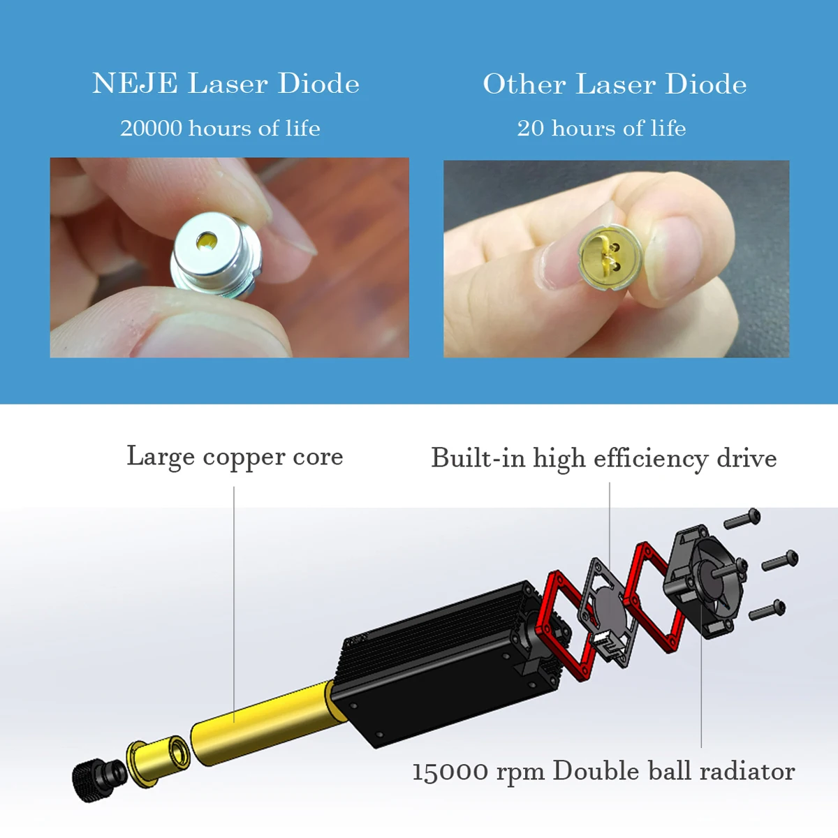Встроенный драйвер платы, 40 мм резьбовой медный сердечник с термопластичной смазкой, датчик температуры, завод NEJE 48 часов 100% испытание на старение энергии, обеспечить долгую работу.