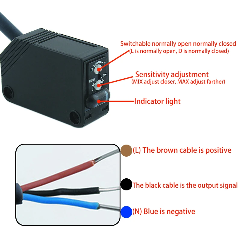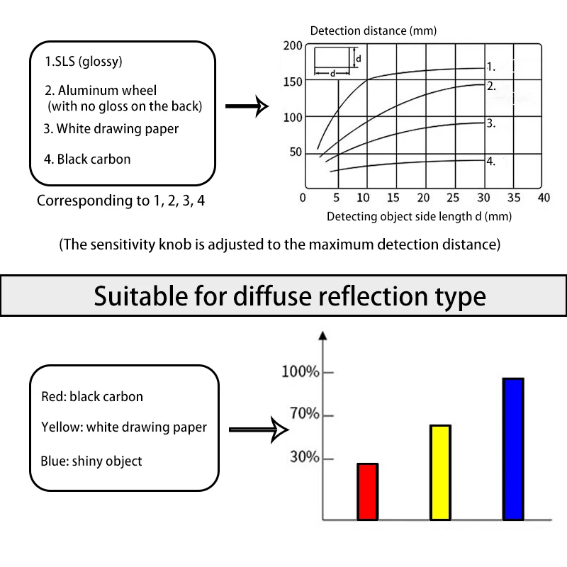 Фотоэлектрический переключатель использует Экранирование или отражение луча на светильник обнаруженным предметом, и цепь соединена схемой синхронизации для обнаружения присутствия или отсутствия объекта. Все предметы, которые могут отражать светильник, могут быть обнаружены. Фотоэлектрический переключатель дымовой сигнализации, обычно используемый в системах безопасности, часто используется в промышленности для подсчета количества движений роботизированной руки. Меры предосторожности: 1. Для обнаружения объектов из разных материалов расстояние обнаружения отличается, как показано на рисунке ниже; 2. Установка: Резьбовая установка, из-за влияния температуры, напряжения и т. д., обычно устанавливается на 85% от номинального расстояния обнаружения; 3. Поверхность обнаружения должна регулярно очищаться, чтобы избежать металлической пыли и других отложений, чтобы избежать воздействия на производительность; 4. Рабочая температура окружающей среды: -25 ℃ ~ + 65 ℃; Относительная влажность 35 ~ 95% ч; 5. Вибрация: Долговечность: 10 ~ 55 Гц сложная амплитуда 1,5 мм, X, Y, Z направления в течение 2 часов каждый; 6. Воздействие: Долговечность: 500 м/с (около 50 г), 10 раз в направлениях X, Y и Z; 7. Для использования в условиях сильного магнитного поля рекомендуется экранированный провод.
