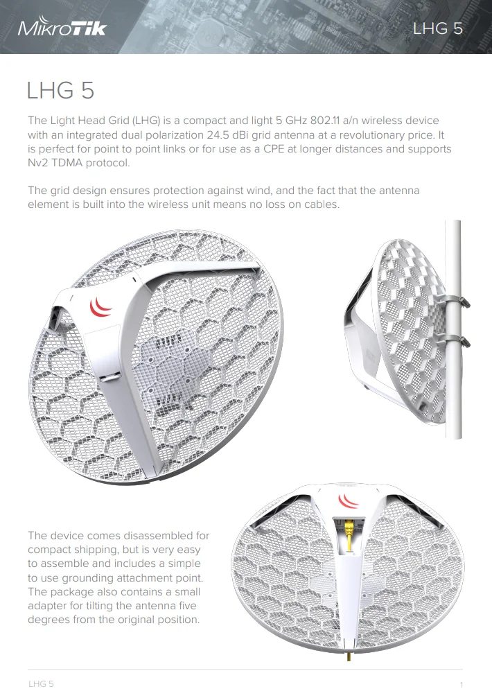 LHG 5 представляет собой компактный и легкий Wi-Fi 5 ГГц 802,11 a/n беспроводным устройством с интегрированным шагомером двойной поляризация 24,5 dBi сеточная антенна на Революционный цена. Идеально подходит для точечных соединений или для использования в качестве CPE на больших расстояниях и поддерживает протокол Nv2 TDMA. Конструкция сетки обеспечивает защиту от ветра, а тот факт, что элемент антенны встроен в беспроводное устройство, означает отсутствие потери на кабелях. У нас есть две версии. LHG 5-US (США) является заводской блокировкой для частот 5170-5250 МГц и 5725-5835 МГц. Этот замок не может быть удален. LHG 5 (Международный) поддерживает диапазон 5150 МГц-5875 МГц (удельный Частотный диапазон может быть ограничен страновыми правилами). Примечание: 3 товара (RBLHG-5nD) будут отправлены в одну посылка.