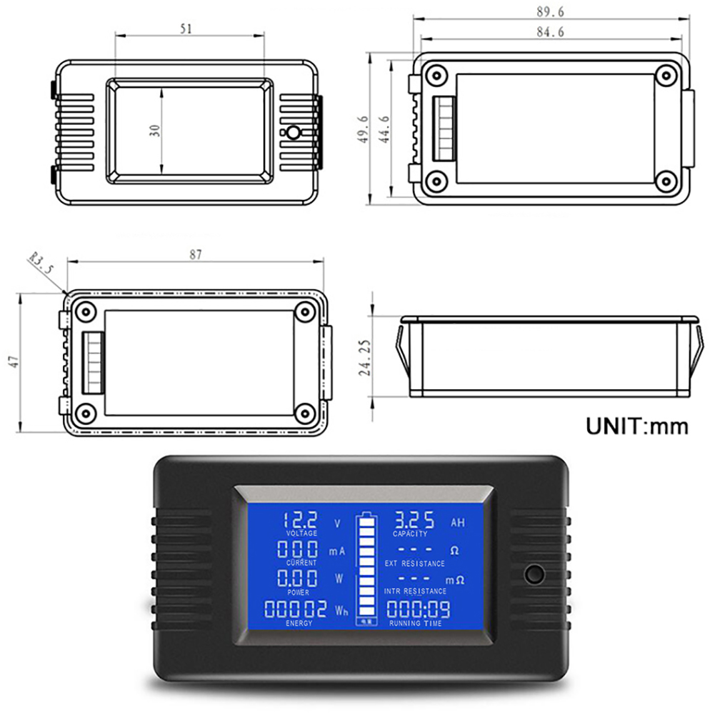 Этот документ описывает спецификацию PZEM-013 многофункционального аккумулятора, этот счетчик в основном используется для тестирования всех видов напряжения батареи, разрядного тока, разрядной мощности, сопротивления разряда, внутреннего сопротивления, емкости, сброс энергии, потребление энергии и время работы, и отображение данных измерений через ЖК-экран.