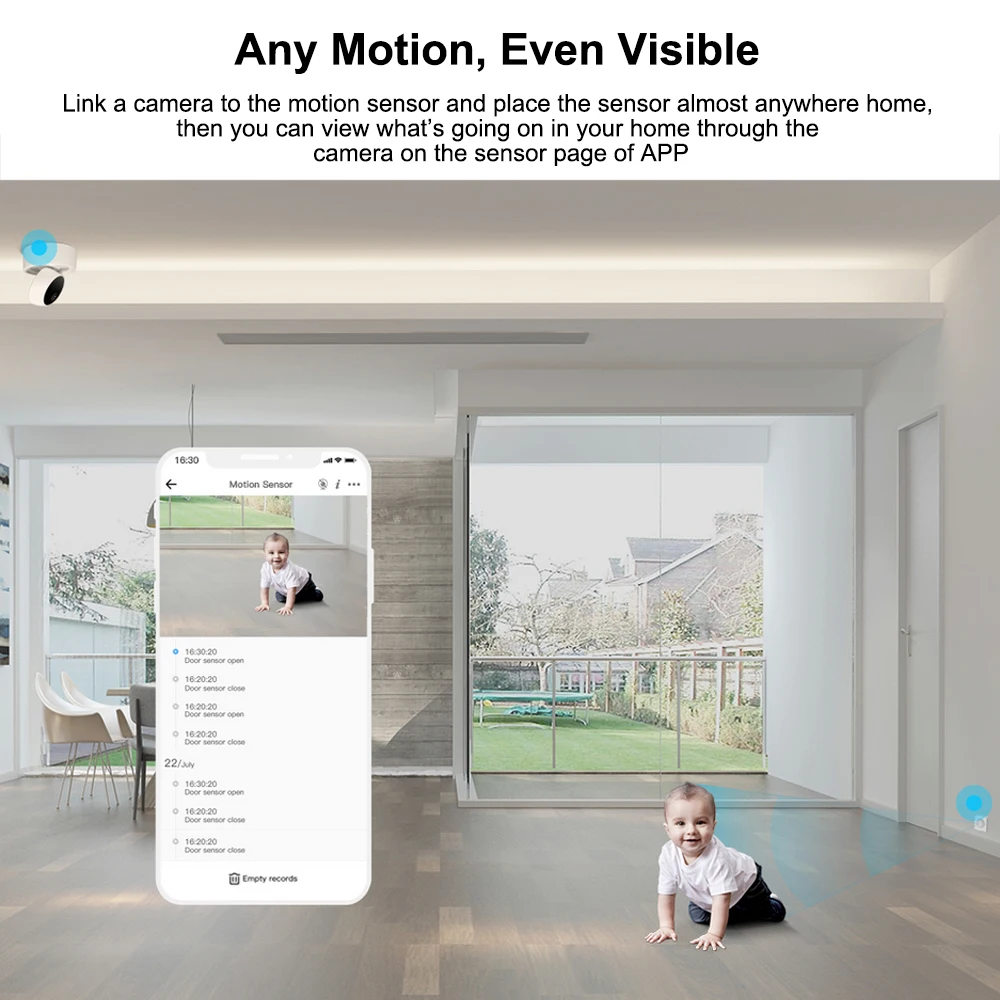* Любое движение, даже видимое: Подключите камеру к датчику движения и поместите датчик практически в любом месте дома, затем вы можете просмотреть, что происходит в вашем доме через камеру на странице датчика приложения.