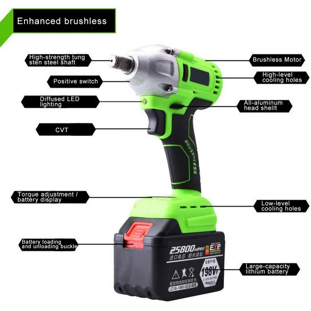1. Беспроводной Электрический ударный ключ, питание от литий-ионной аккумуляторной батареи. Перезаряжаемая литиевая батарея, большая емкость2. Цвета могут отличаться, так как на дисплее разница, пожалуйста, поймите.