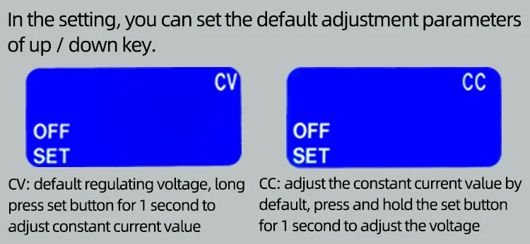 4,1. Используется в качестве общего источника питания, повышающего и падающего напряжение, с защитой от перенапряжения/перегрузки по току/перегрузки/перегрева/пониженного напряжения; (1) Установите значение напряжения. (2) Установите значение постоянного тока (значение защиты от перегрузки); (например, если значение постоянного тока 3,00 А, максимальный ток может достигать 3 А при использовании продукта, И когда ток достигает 3 А, на ЖК-дисплее будет отображаться статус «CC», иначе на ЖК-дисплее будет отображаться « CV "статус)