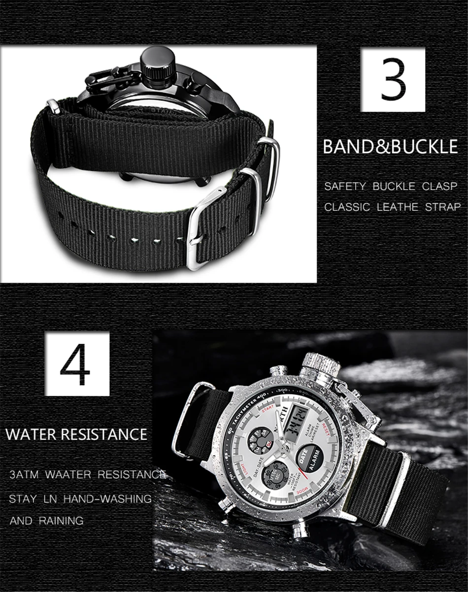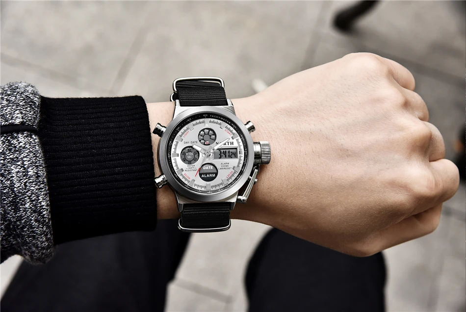 100% новые и высококачественные Будильник с 4 мин, Повтор Отображение дня, даты и времени Chrime на каждый час Хронограф с круговым механизмом и 1/100 Двухъядерный процессор Аналоговый и приёмник цифровой дисплей Функция EL (синий) Функция ежечасного боя часов Нейлоновый ремешок Reistant воды