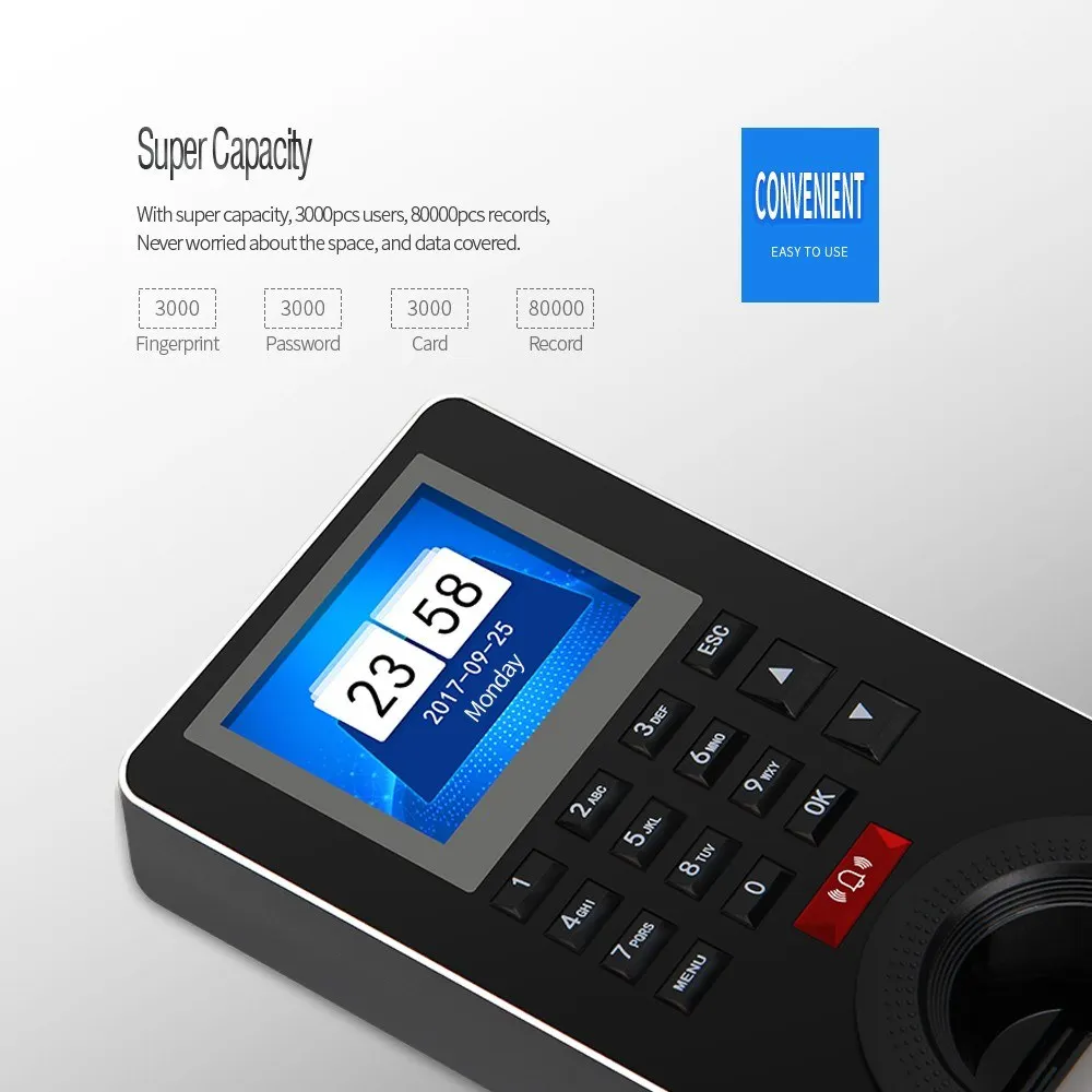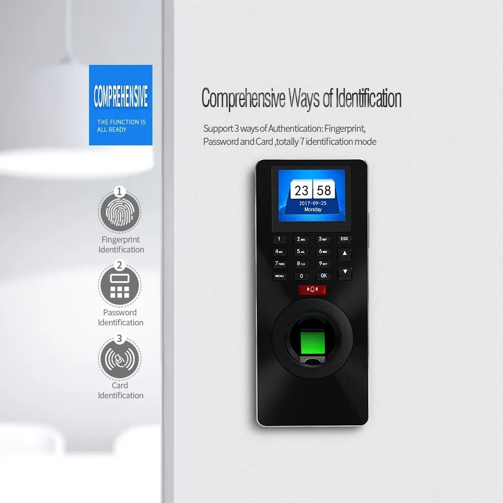 ZK-FP18 машина контроля посещаемости времени и доступа предназначена для офиса, применяя усовершенствованный Алгоритм распознавания отпечатков пальцев для достижения скорости распознавания менее 1 с, поддержка TCP/IP, беспроводной/проводной дверной звонок, И достичь нескольких способов аутентификации, включая отпечаток пальца, пароль, IC карту. Особенности: Умные технологии hi-technology создают более безопасный мир Несколько способов идентификации включают отпечаток пальца, пароль и карту, всего 7 режимов идентификации. Идеальная функция посещаемости времени Удобное и улучшенное планирование позволяет легко работать с различными рабочими системами, включая многосменные, нечетные и даже недели, для легкой загрузки отчетов о посещаемости и классификации статики сверхурочной работы и отпуска и т. д. Супер емкость С супер емкостью, 3000 пользователей, 80000 записей. Вход отпечатка пальца Может использоваться в качестве считывателя для сбора данных по отпечаткам пальцев. Функции сигнализации Включает в себя охранную сигнализацию и систему устрашения и т. д. Контроль доступа Более 50 периодов времени, 10 механизмов контроля доступа, 5 групп разблокировки, позволяет легко устанавливать ограниченное время прохождения, разные люди и отделы открывать дверь и т. Д. С Wiegand Communication Функция Wiegand in/out позволяет подключать блок контроллера доступа и считыватель, а также выполнять строгую проверку входа и выхода с помощью карты. Совместимость Подходит для одностворчатой стеклянной рамы двери, одностворчатой стеклянной рамы-двери, одностворчатой деревянной рамы двери, одностворчатой стеклянной рамы двери, двухстворчатая стеклянная рамка-бездверная дверь, Двухстворчатая деревянная дверная рама. Характеристики: Модель: ZK-FP18 TFT LCD: 2,4 "цветной дисплей с высоким разрешением Аутентификация: отпечаток пальца + пароль + IDIC карта Пользователь: 3000 Шаблоны отпечатков пальцев: 3000 Пароль: 3000 IDIC карта: 3000 Емкость записи: 80000 Беспроводной дверной звонок: Да Скорость проверки: ≤ 1 с Режим проверки отпечатков пальцев: 1:1; 1:N FRR: ≤ 0.01% Дальность: ≤ 0.0001% Связь: USB flash, TCP/IP Функция s: поддержка стандартных wiegand 26/34, сигнализация, функция сброса, аутентичный голос Рабочая температура: -10-45 градусов Рабочая влажность: 20-80% Расстояние: 80-100 см/31,5-39,4 дюйма Язык: английский, китайский Размер изделия: 20*8,3*3,2 см/7,9*3,3*1,3 дюймов Вес изделия: 436 г/15,4 унции Размер посылка: 29*12,5*5,2 см/11,4*4,9*2,0 дюймов Посылка: 1 * машина посещаемости 1 * дверной Звонок 1 * пакет винтов 1 * IC карта 1 * оптический диск 1 * набор кабелей