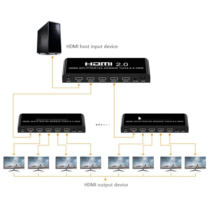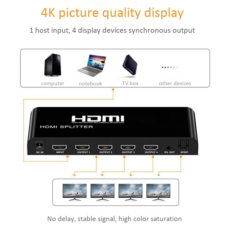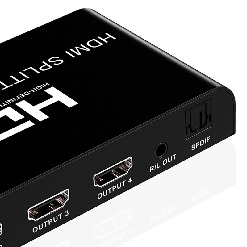 10. Этот сплиттер HDMI 1x4 может подключать устройства высокой четкости, такие как приставки, dvd-плееры, ноутбуки, PS3, PS4, игровые консоли, HDTV, И т. Д. До 4 дисплейных устройств через интерфейс выхода HDMI, так что 4 дисплейных устройства отображают ту же картинку