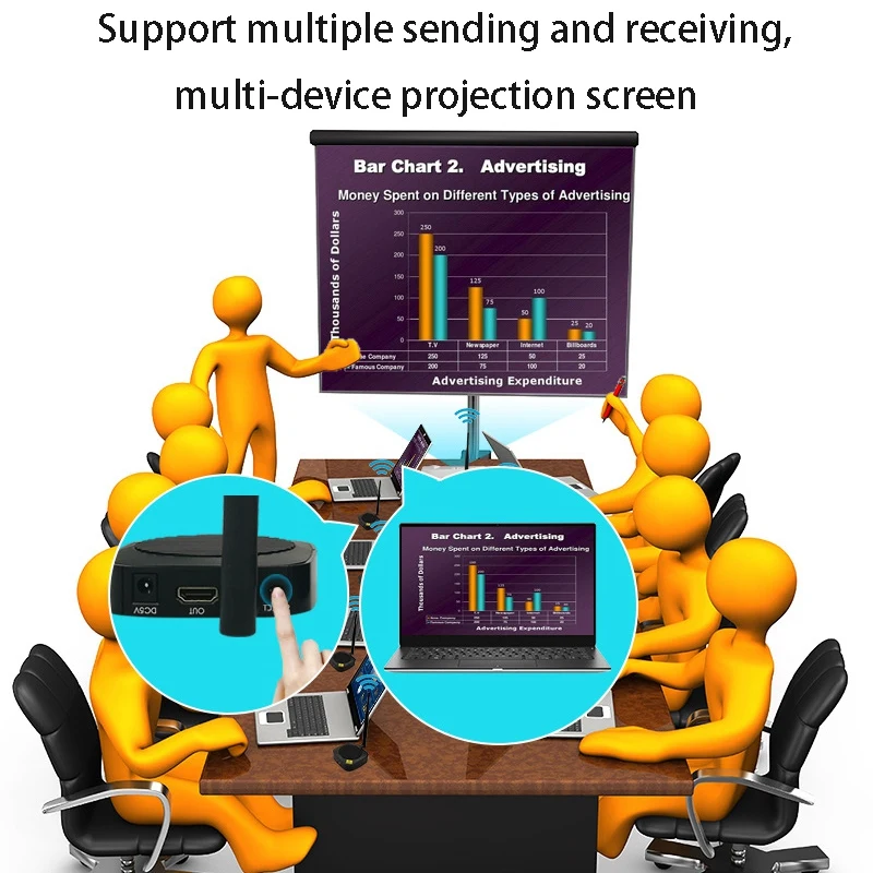HDMI видео и о сигналы передаются через встроенный беспроводной Wi-Fi. Открытая среда транспортируется до 50 метров, и перегородка передается до 25 метров.