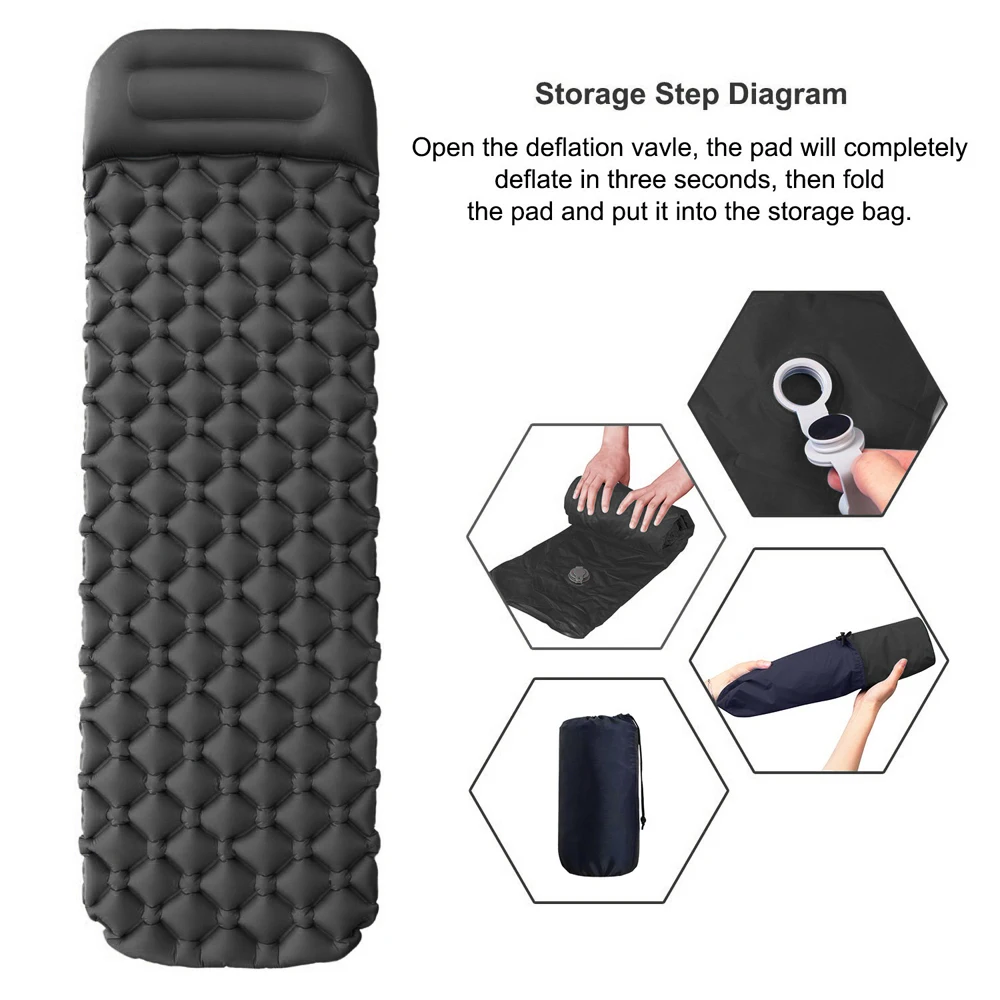 Этот спальный коврик имеет Ламинирование из ТПУ и покрытие из полиуретана, устойчивый к разрывам, водостойкий и практичный. С быстрым потоковым клапаном вы можете надуть подкладку всего за 10-15 дыханий, в то время как дефляция занимает всего несколько секунд. Надутая подкладка имеет специальные спроектированные узоры клеток, которые контурны для человеческого тела и обеспечивают удобную, сбалансированную поддержку вашей спины. Со встроенной подушкой вы можете хорошо спать, не покупая экстравагантную подушку или беспокоясь о том, что подушка ускользнет. Его гибкая структура также идеально подходит для стула или гамака, под/внутри вашего спального мешка, так что вы можете преследовать комфортную жизнь даже снаружи. Упакуйте легкую спущенную подкладку в мешок для хранения и положите ее в рюкзак, чтобы организовать новое путешествие.