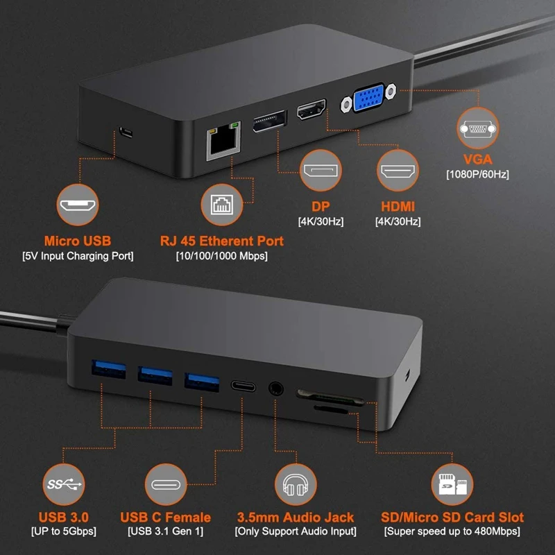 Закрепите их с помощью этой док-станции Surface Pro 4 /5/6! Тонкий порт способный дизайн для Surface pro hub оснащён портом USB 3,1 (для передачи данных), гигабитным портом RJ45, 4K разъемом HDMI, портом VGA, портом DP, слот для карт SD/TF, 3х USB 3,0 порт s, 3,5 мм разъем для наушников, с простым подключением и воспроизведением.