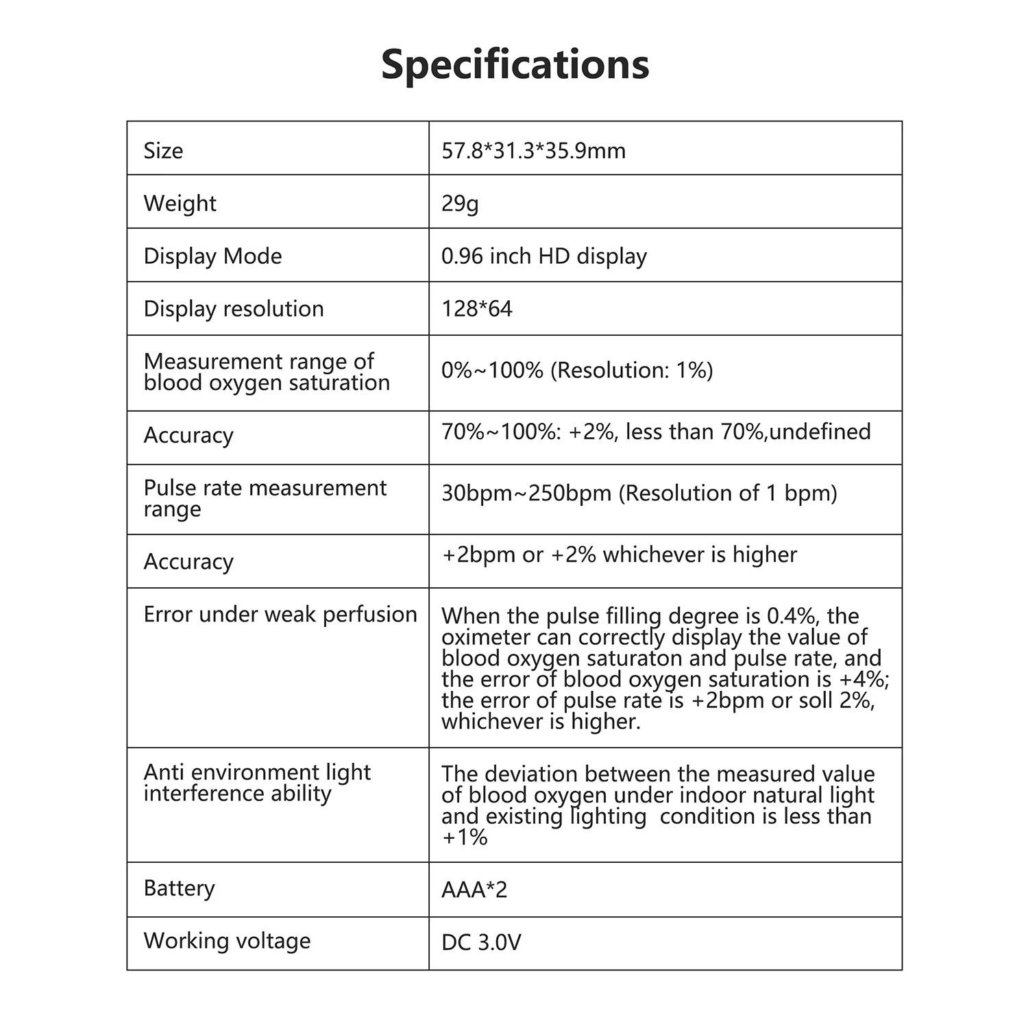 Измерение уровня кислорода в крови точность: 70 ~ 100%, ± 2%-± 3%, менее 70% не определен