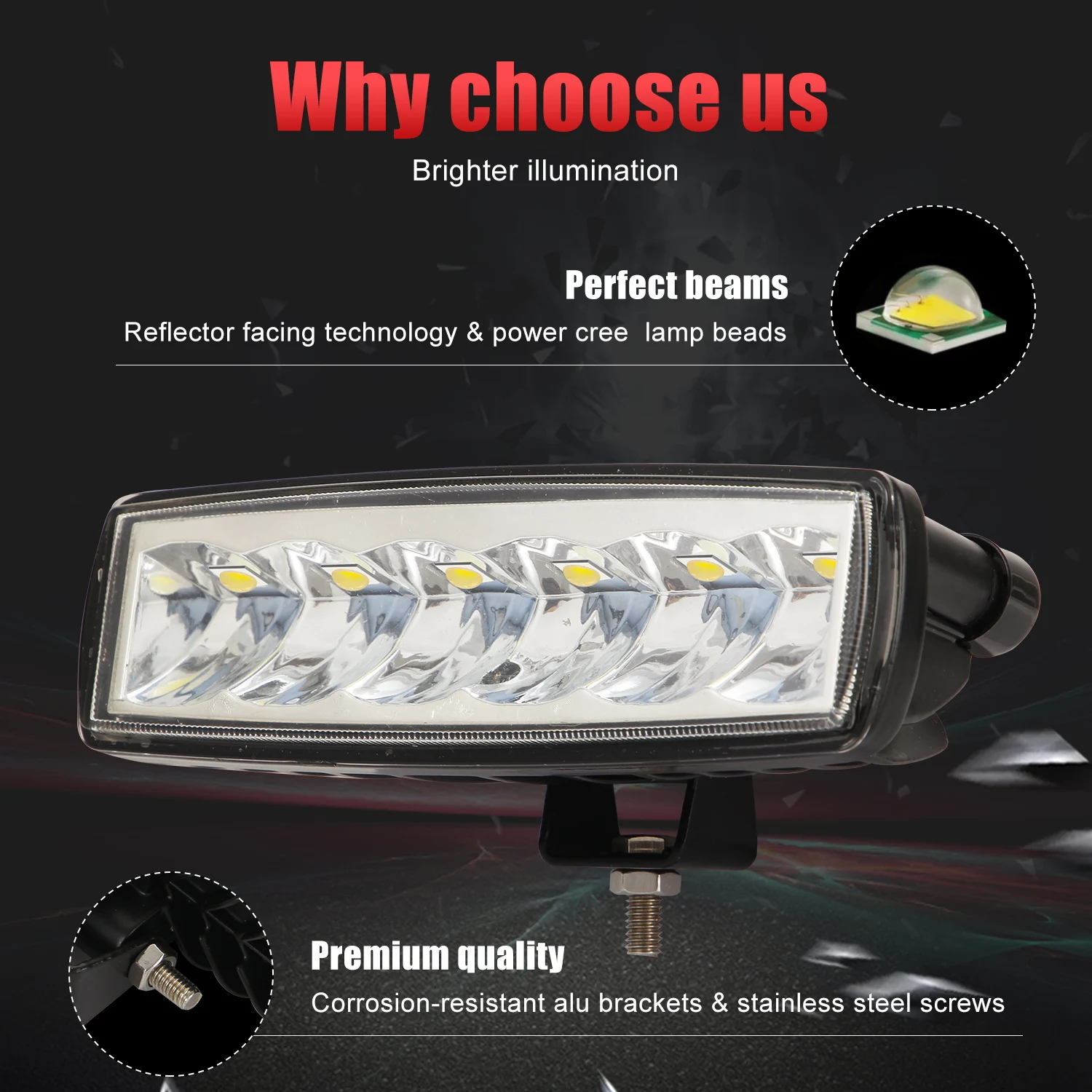 -Световой поток: 2880 люменов каждый светильник -Напряжение: 9-30 в -Рабочая температура: от-40 ℃ до + 80 ℃ -Степень водонепроницаемости: IP 67 -Корпус: алюминиевый сплав -Конструкция линз: поликарбонат -Кронштейн: алюминиевый сплав -Цветовая температура: 6000 K -Срок службы: 50 000 часов -Подходит для установки: все типы -Балки в наличии: Наводнение
