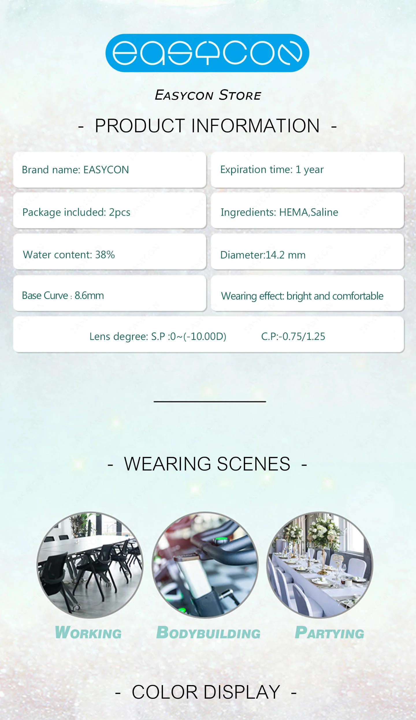 Толщина центра: 0,035 мм Основание кривое: 8,6 мм Диаметр: 14,2 мм Материал линз: хема/силиконовый гидрогель Мощность объектива: 0-800(0 ~-8,0) Посылка: 1 пара (2 шт.) контактных линз
