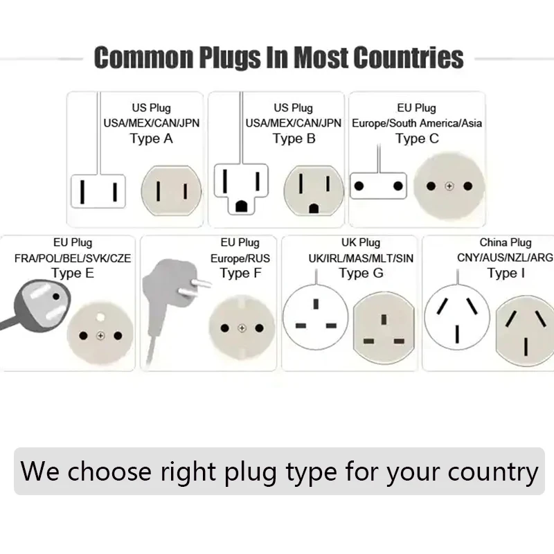 4. Продукт имеет вилки для ЕС, Австралии, США, Великобритании, мы отправим соответствующую вилку в соответствии с вашей страной.