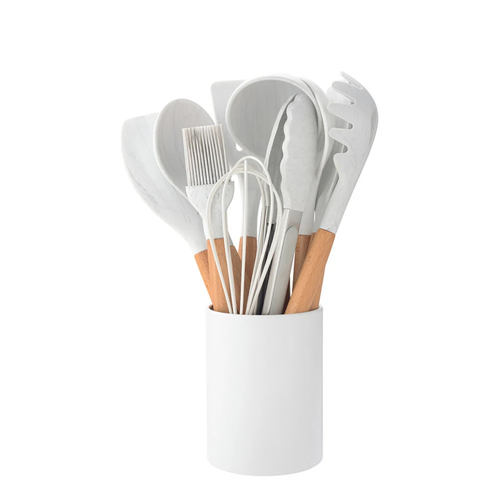 Наборы кухонной утвари включают 11 силиконовых инструментов для приготовления пищи и ведро для хранения, разнообразие для удовлетворения всех ваших потребностей.