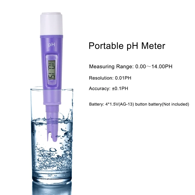 Предназначен для проверки уровня pH раствора/воды. Поддержка автоматической компенсации температуры (ATC) от 0 ℃ до 50 ℃. Прозрачный ЖК-экран для удобного чтения данных. Простота в использовании, обеспечивает быстрое, точное и надежное считывание с уровнем pH. Широко используется в водных источниках, бассейнах, аквариумах, лабораториях, гидропонике и т. д. Компактный и портативный размер, легко носить с собой. Питание от 4*1,5 в (ag-13-ти таблеточная) кнопка батареи (не входит в комплект).