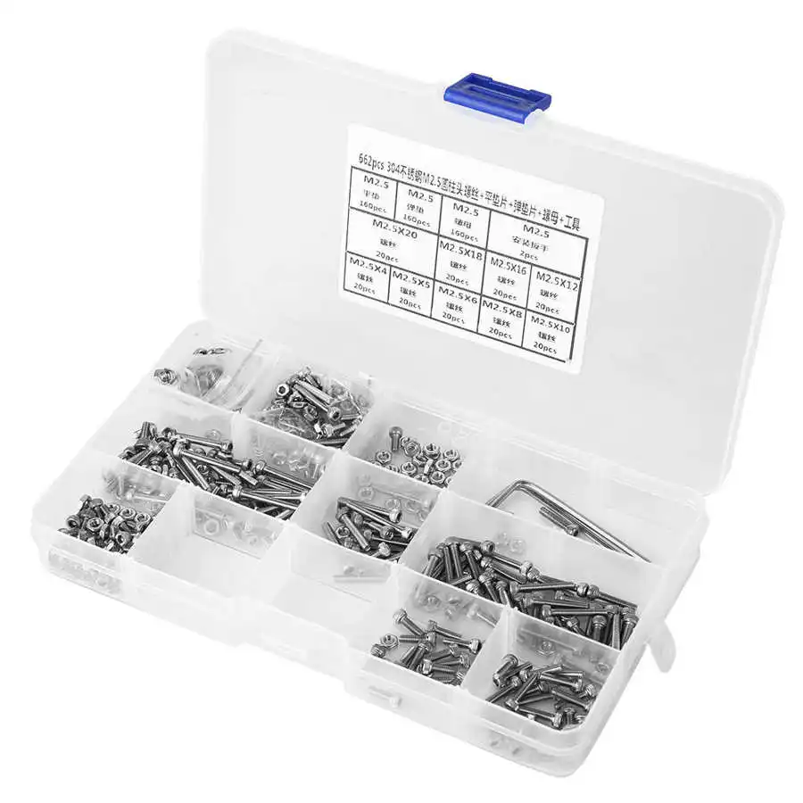 В комплект входят 9 видов винтов, плоская прокладка, пружинная шайба, гайка и монтажный ключ.