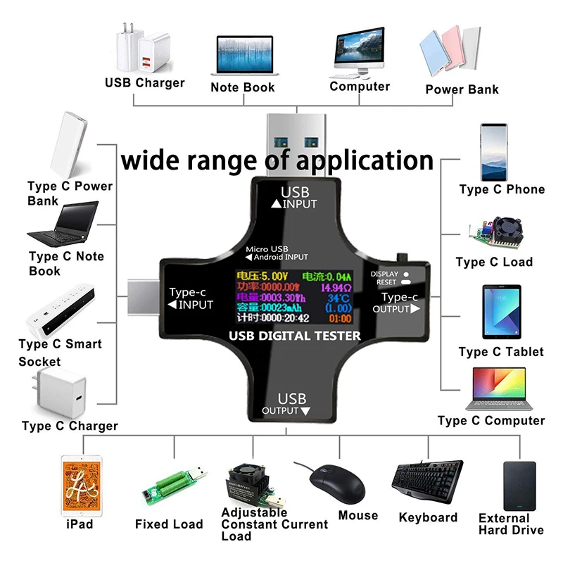 [Широкий спектр применения]: usb-тестер поставляется с адаптером OTG, поддерживает PD3.0/PD2.0, QC3.0/QC2.0 и несколько интерфейсов, этот новый мультиметр поддерживает обновленный мобильный телефон iPhone 11 Pro. (Поддержка быстрой зарядки iphone 11/X/iPhone Xs, мощность 29 Вт, 5V3A / 9V3A / 12V2.5A / 15V2A). Он также может быть применен для тестирования других устройств типа C, таких как Samsung Galaxy S9 Plus, Google ChromeBookPixel, OnePlus, HuaWei P9 и т. Д.