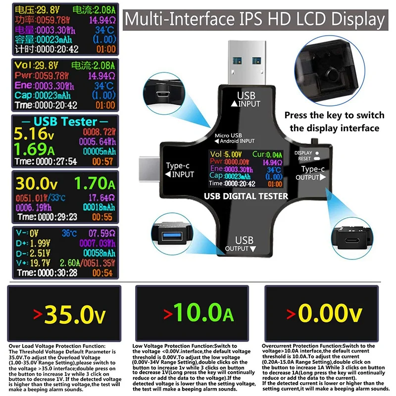 [Новейший усовершенствованный цветной дисплей IPS Sn]: Новая обновленная версия предлагает 8 интерфейсов отображения основного цвета IPS sn, что позволяет переключать интерфейс дисплея нажатием кнопки. С новыми настройками интерфейса, этот инструмент может контролировать напряжение, ток, емкость, электрическое количество, мощность, сопротивление нагрузки, D/D-напряжение и Другие данные USB.(Улучшенный IPS HD Цвет sn более четкий, чем старый LCD Цвет sn. Поддерживает переворачивание sn до 180 градусов и 3 вида персонализированных интерфейсов!)