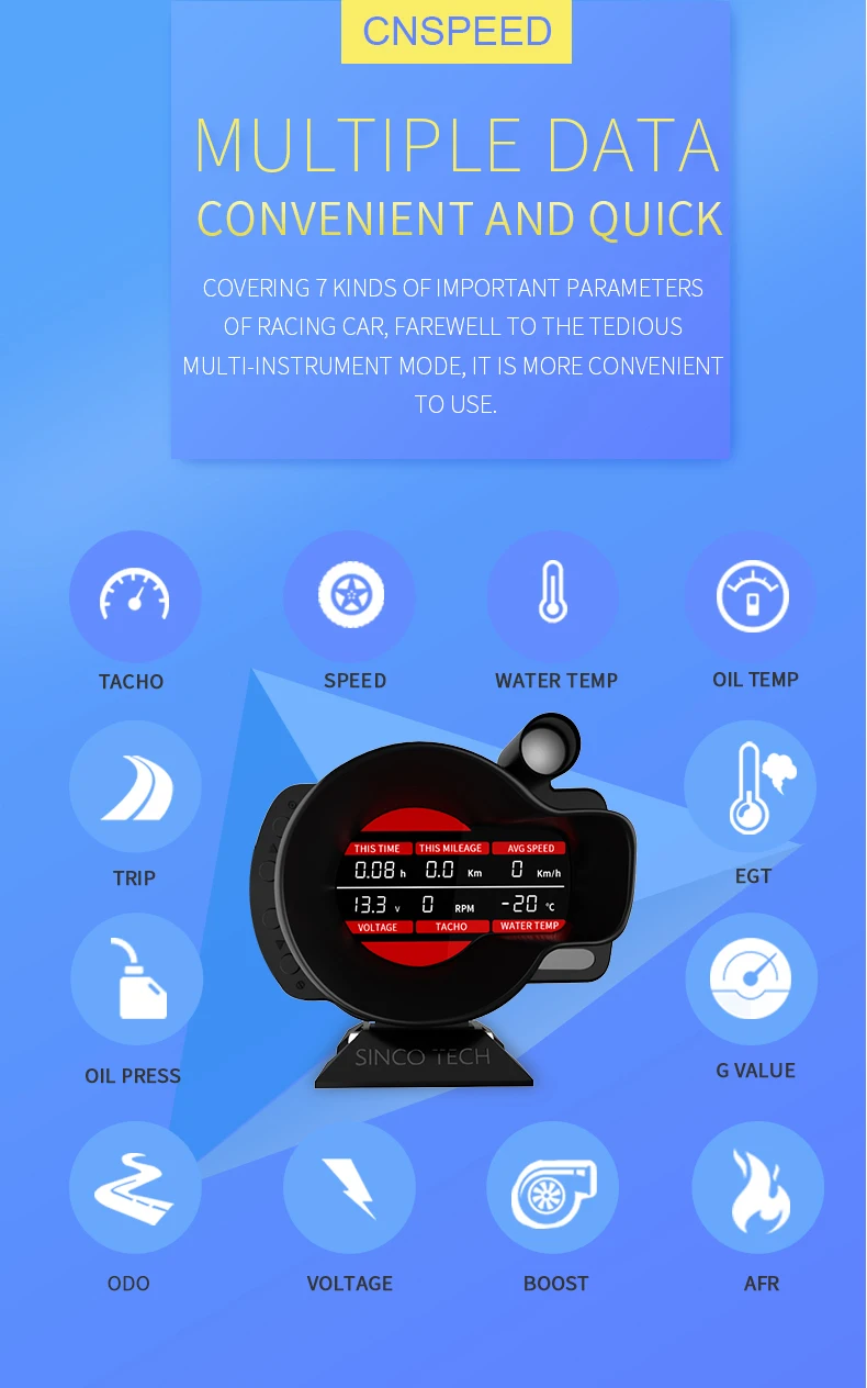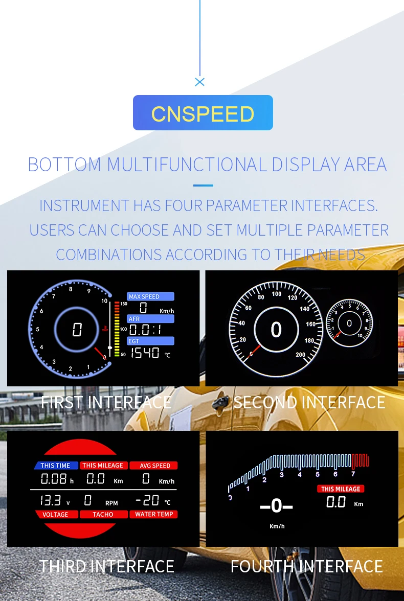 Main Function Display 1.Speed 2.Tacho 3.Water Temp. 4.Intake Manifold Absolute Pressure (MAP) 5.Intake Air Temperature (IAT) 6.Air Flow Rate From MAF (MAF) 7.Pedal Position 8.Engine Load 9.Ignition Advance Angle 10.Voltage 11.ODO 12.TRIPA 13.TRIPB 14.Total Time 15.This Time 16.This Speed Average 17.This Speed Max 18.This Mileage