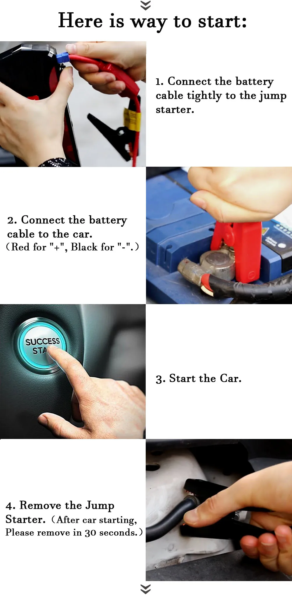 1. Для вашей безопасности, пожалуйста, не разбирайте стартер скачка. После демонтажа самостоятельно, мы не будем обслуживать любые возникшие проблемы. 2. Перед запуском двигателя убедитесь, что пусковое устройство полностью заряжено. 3. Если стартер скачка не может начать в одно время. Повторите попытку через 30 секунд или дольше и начните медленнее.