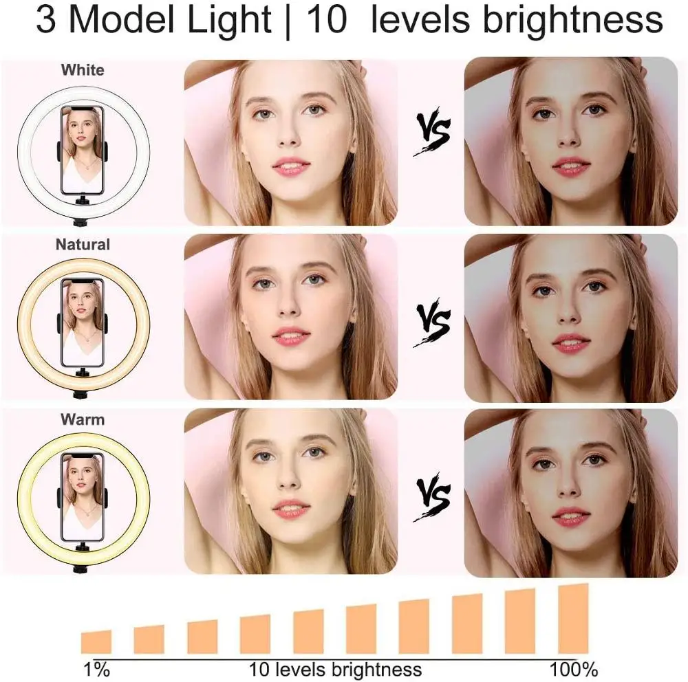 Кольцевой светильник подробнее о продукте: Потоковое вещание светодиодный поток светильник 1. Три светильник режимов (белый, теплый белый, теплый желтый) 2. Устойчивый Штатив с противоскользящими ножками 10 освещение Яркость уровней 3. Универсальный держатель для мобильного телефона (2,36 "до 3,35" в ширину, только для 26 см кольцевой светильник) Быстрая и простая сборка, разборка 4. Регулируемый светильник-подставка подходит для универсальных высоких и очень стабильных. 5. Со студией, чтобы заполнить светильник фото, портрет автоспуска заполняющий светильник. 6. Кольцевой светодиодный светильник для фотостудии с usb-разъемом, заполняющий светильник. 7. Подходит для многих социальных, таких как создание, видео в режиме реального времени, студийный светильник, фотография. Посылка включает в себя: Пожалуйста, посмотрите на картинку