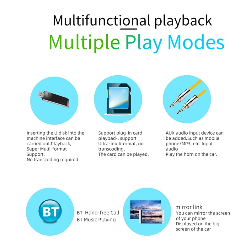 Высококачественное цифровое стерео fm-радио, автоматический режим поиска каналов, полуавтоматический и точный метод регулировки. Слушайте музыку, новости и информацию о дорожном движении, где угодно и наслаждайтесь. Воспроизведение U disk/AUX: Поддержка U disk для воспроизведения, вам нужно только вставить u-диск в интерфейс устройства для воспроизведения музыки Поддержка внешнего входа AUX (plug) o. Функция tf-карты: Поддержка Большой карты памяти TF, вы можете скачать музыку или фильмы, играть на этом устройстве