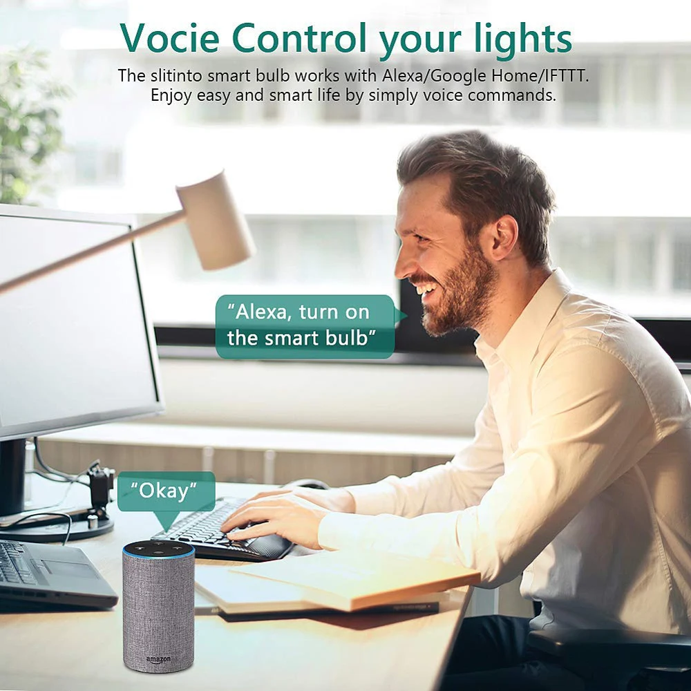 Работает с Wi-Fi (2,4 ГГц) или мобильного телефона трафика, Управление загореться постоянно в любом месте с вашим ios/andriod смартфон или планшет. Приложение позволяет управлять одной лампой или групповыми лампами и управлять ими вместе. Работает с Amazon Alexa и может управляться голосом
